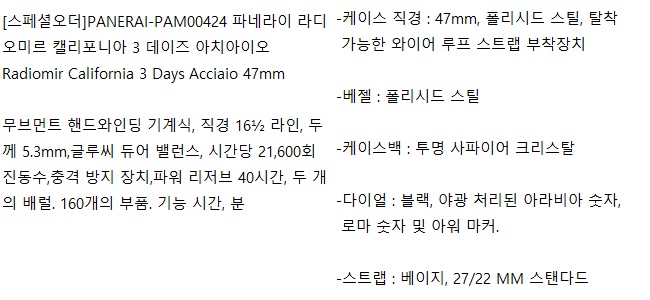 [스페셜오더]PANERAI-PAM00424 파네라이 라디오미르 캘리포니아 3 데이즈 아치아이오 Radiomir California 3 Days Acciaio 47mm