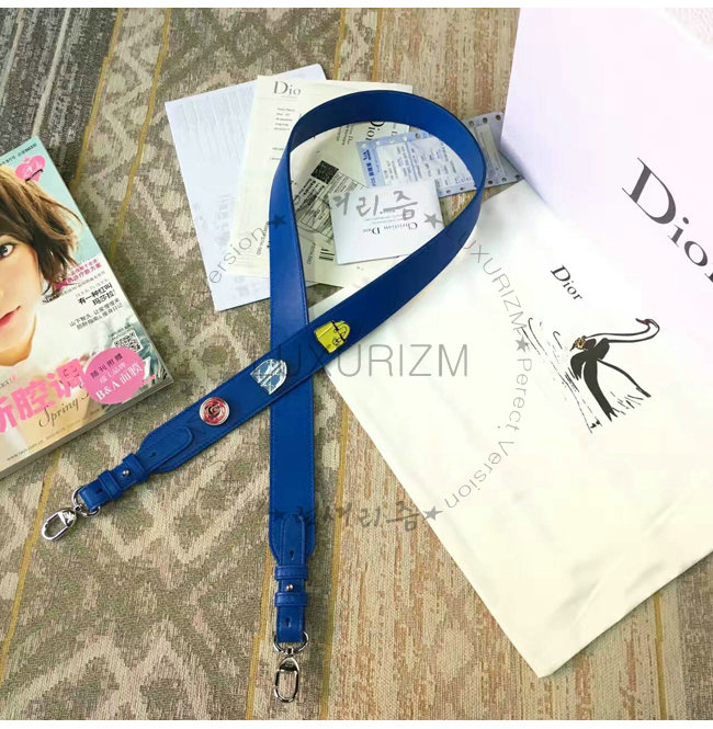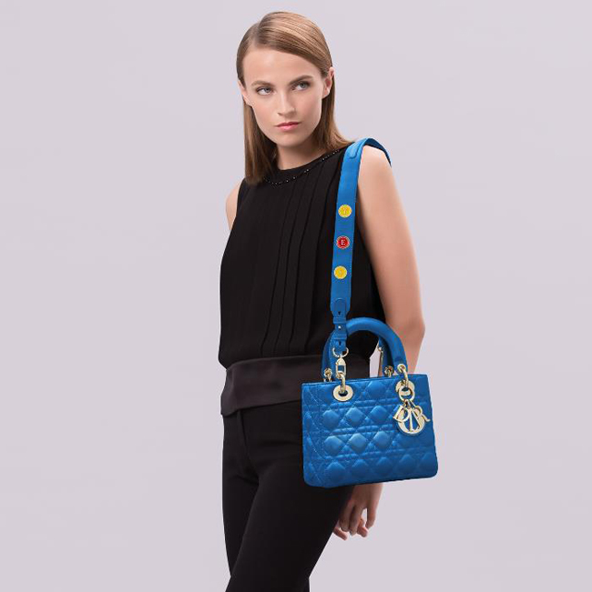 스트랩을 맞춤 제작할 수 있는"Lady Dior" 블루 양가죽 백으로 까나쥬 스티칭 장식이 특징