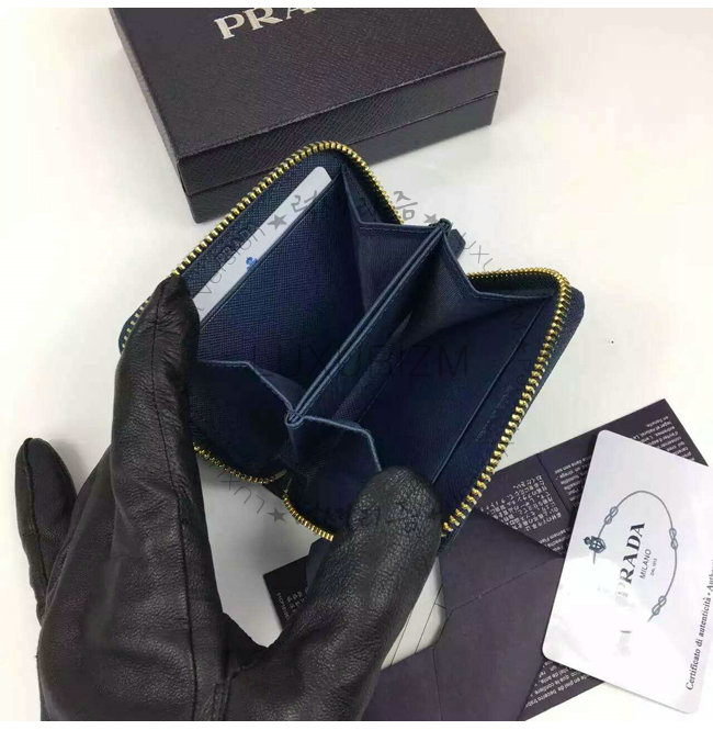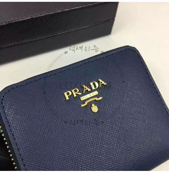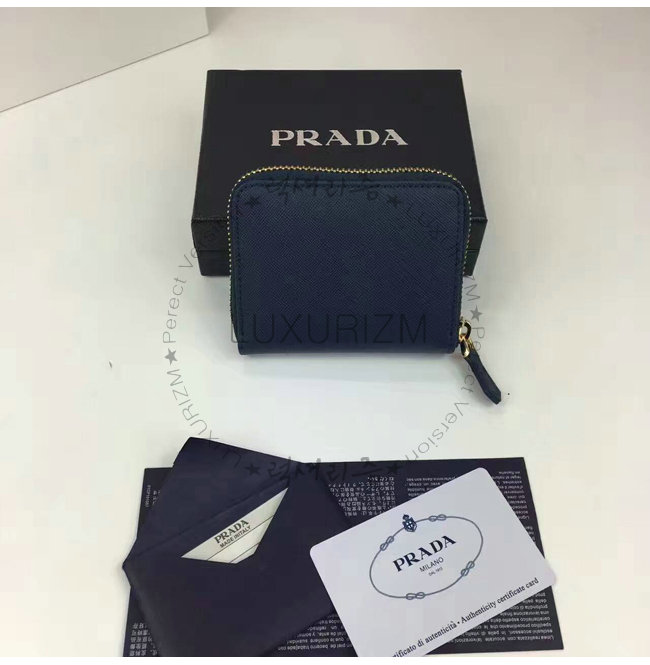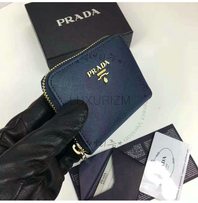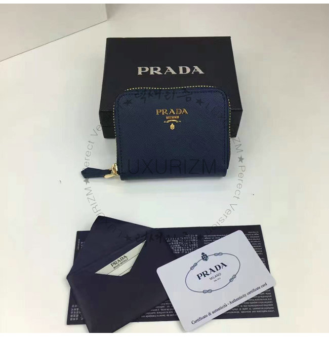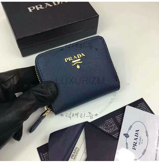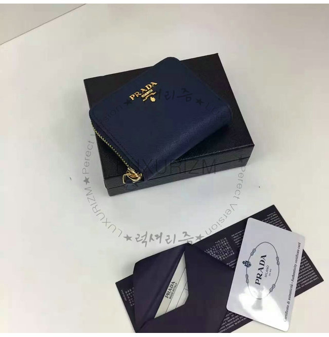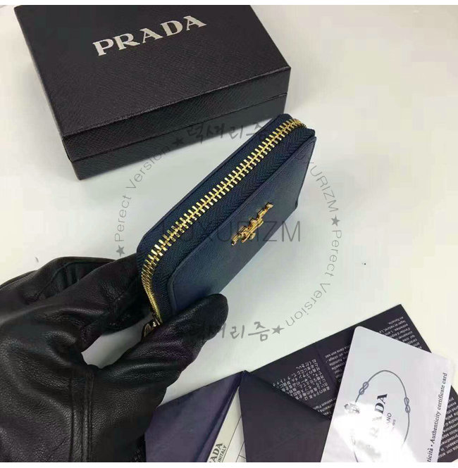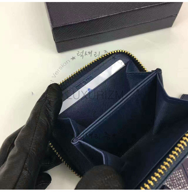 PRADA-1MM268 프라다 사피아노 메탈릭 골드 가죽 동전 지갑 네이비