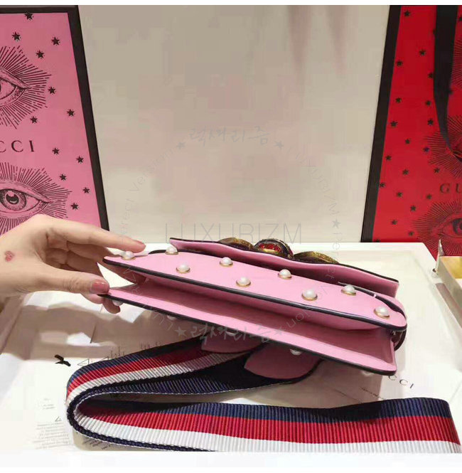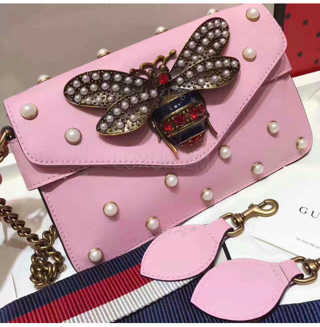 -2017 크루즈 컬렉션/라이트 핑크 가죽 및 펄 장식/메탈 벌 장식의 펄 및 크리스탈 디테일/메탈 잠금장치.