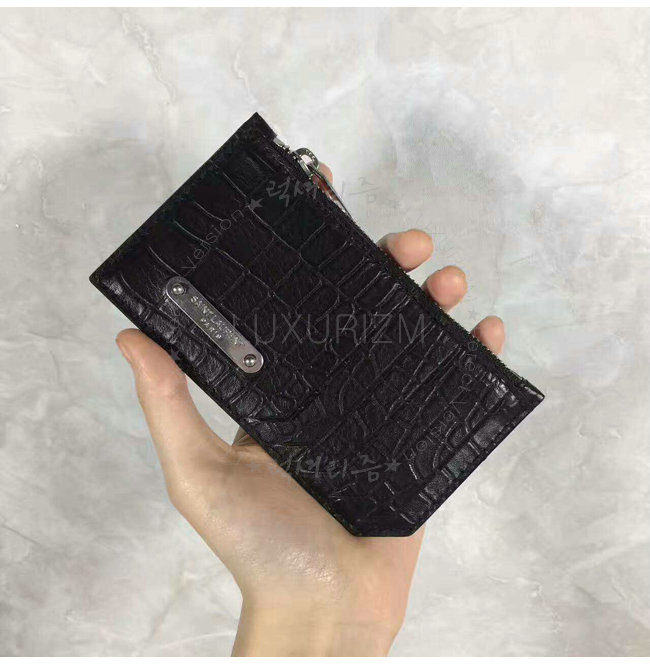 프론트 카드 슬롯과 생 로랑 시그니처가 새겨진 메탈 플레이트 디테일의 지퍼 케이스.