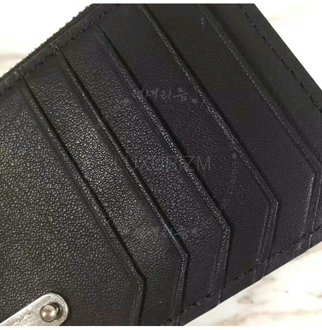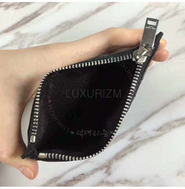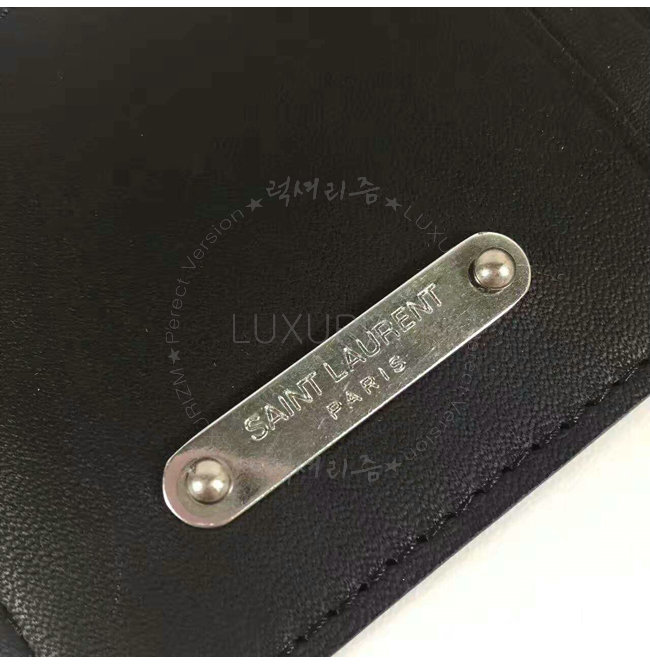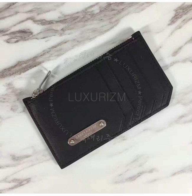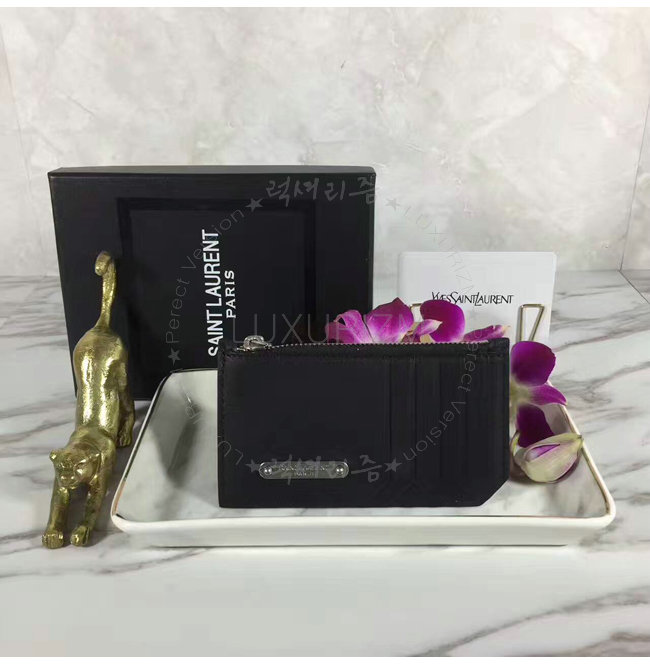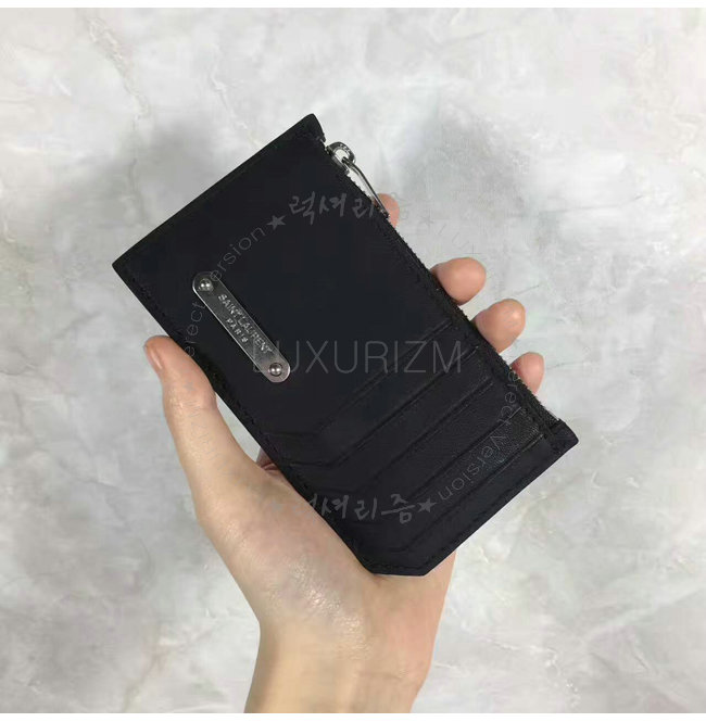 프론트 카드 슬롯과 생 로랑 시그니처가 새겨진 메탈 플레이트 디테일의 지퍼 케이스.