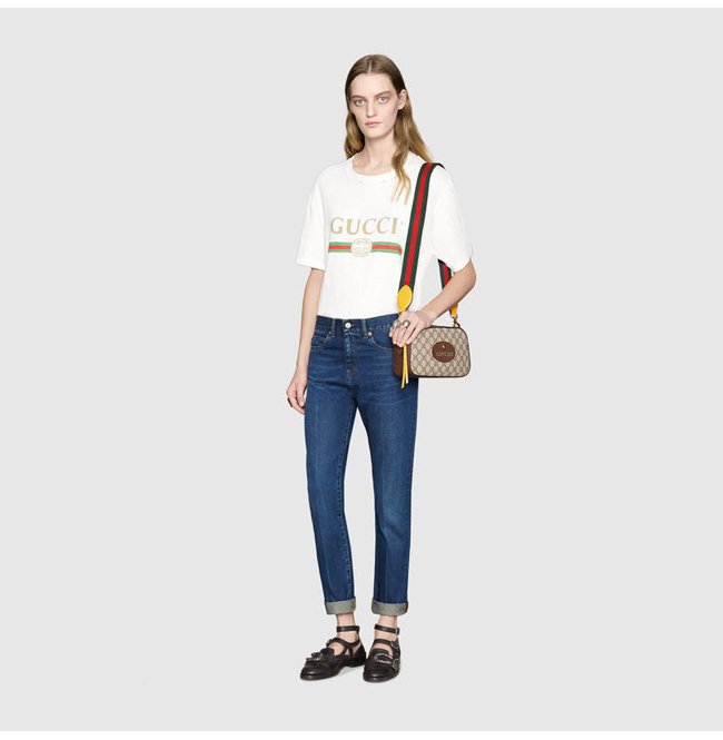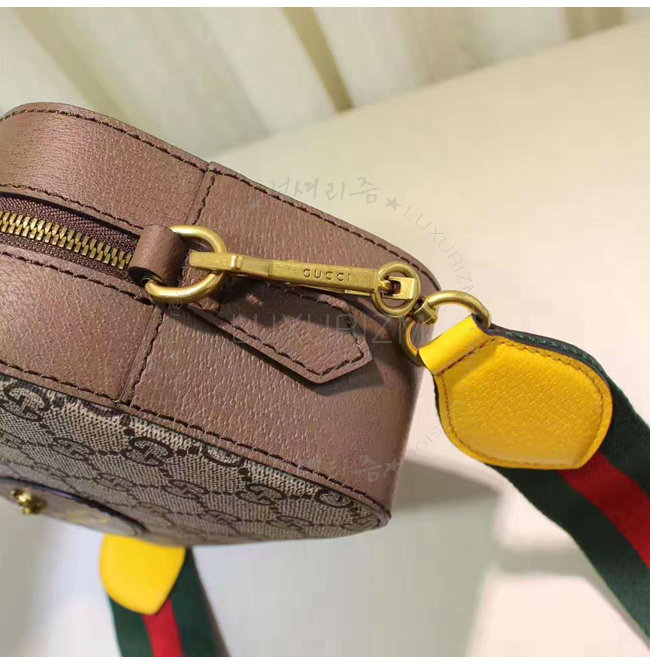 하우스 웹 스트라이프로 장식된 옐로우 가죽 디테일의 GG 수 프림 캔버스 소재의 메신저 백