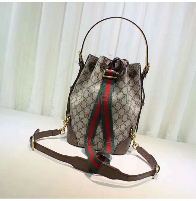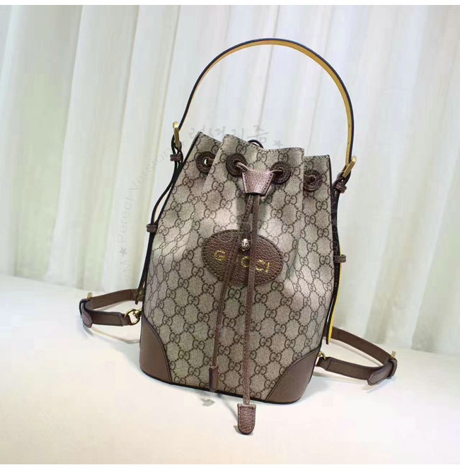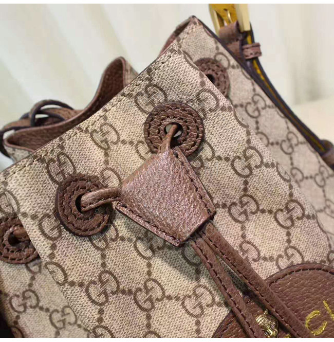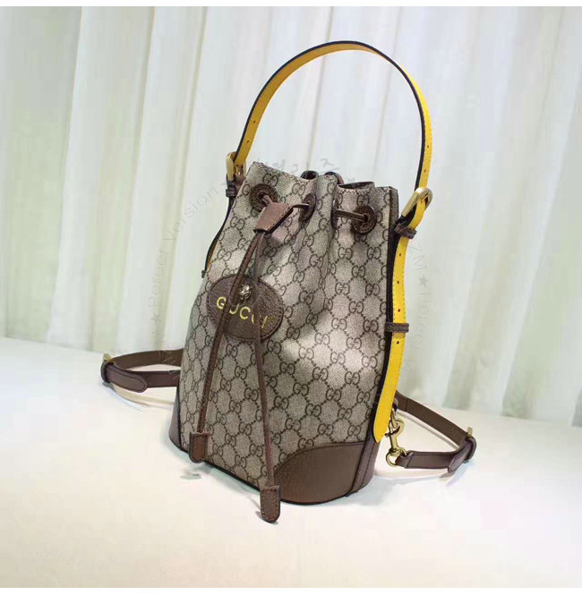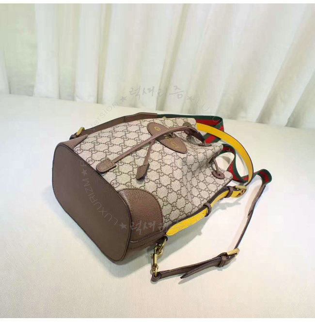버킷 형태의 드로우스트링 백팩. 코팅 처리된 마이크로파이버 패브릭으로 제작한 소프트 GG 수프림.