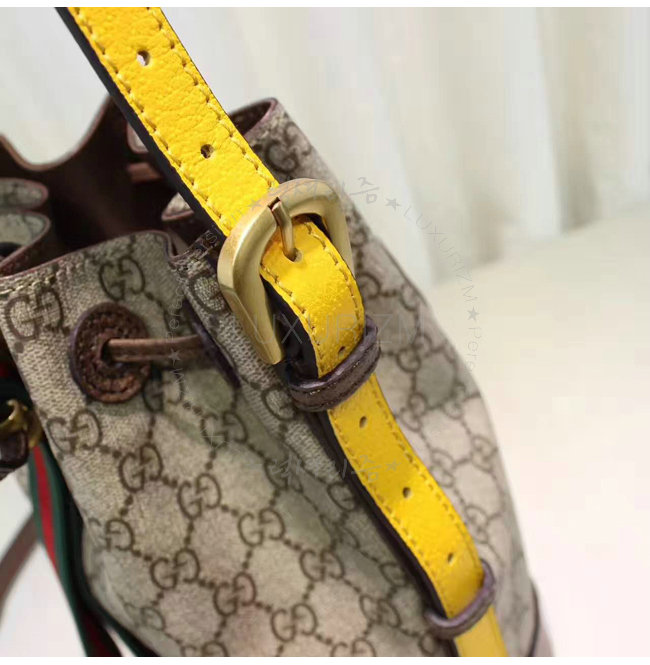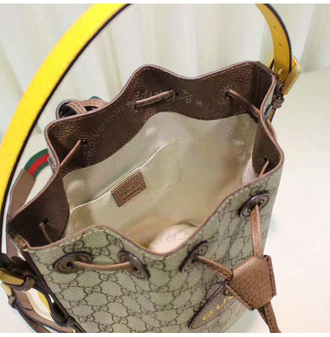 디테일의 타원형 구찌 가죽 태그 내부 지퍼 및 스마트폰 포켓 조절 가능한 옐로우 가죽 탑