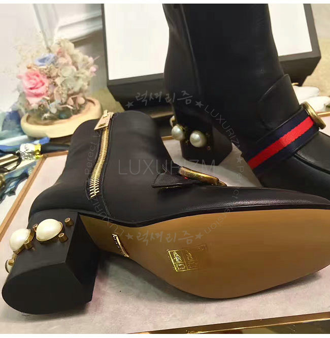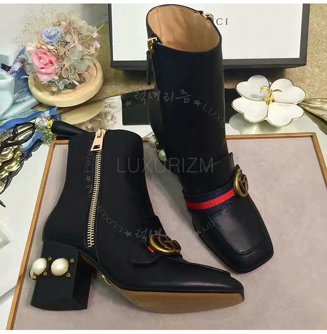 GUCCI-432060 1061 구찌 블랙 가죽 글라스 펄 미드힐 앵클 부츠 여성용