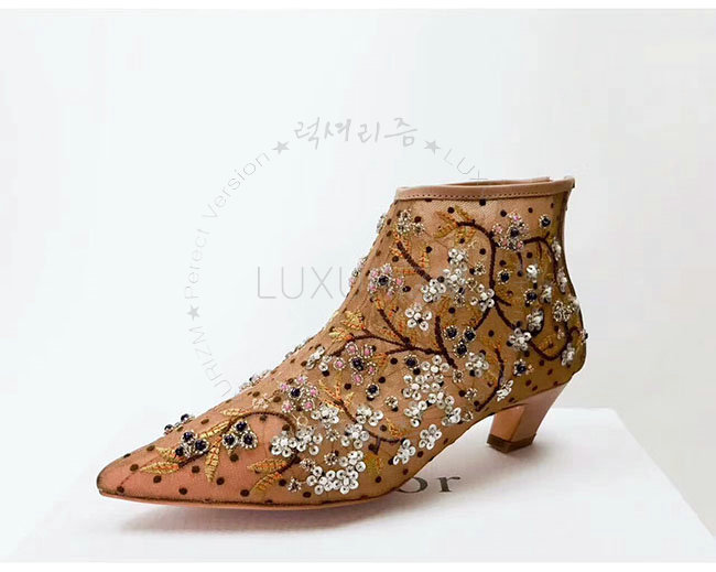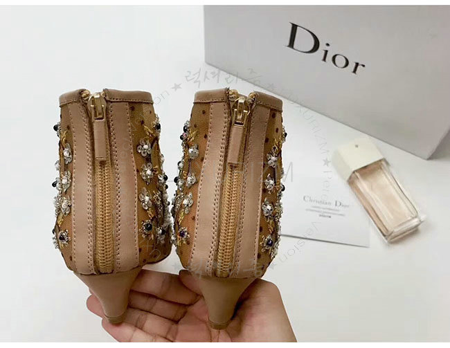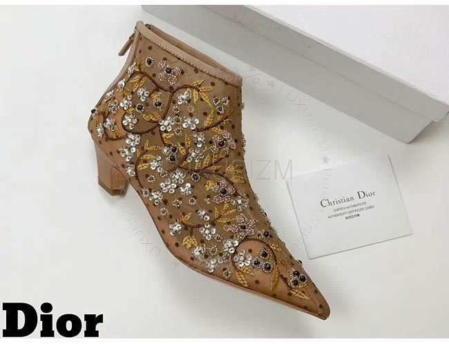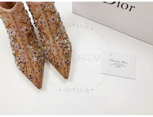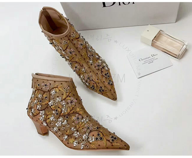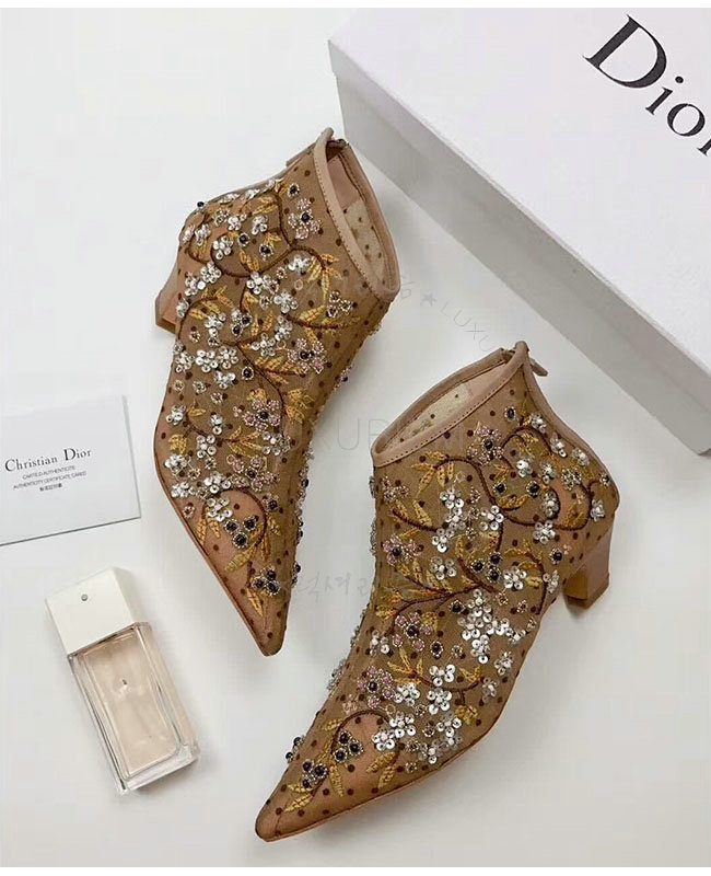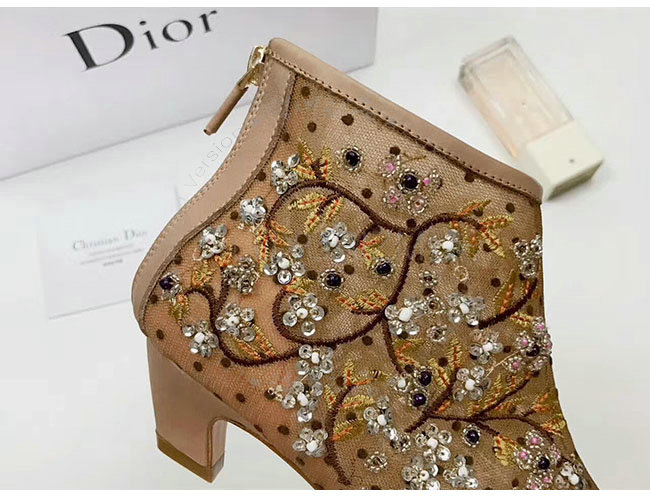 DIOR-KDM177 디올 플라워 자수 장식 도티드 브라운 스위스 튤 앵클 부츠 여성용
