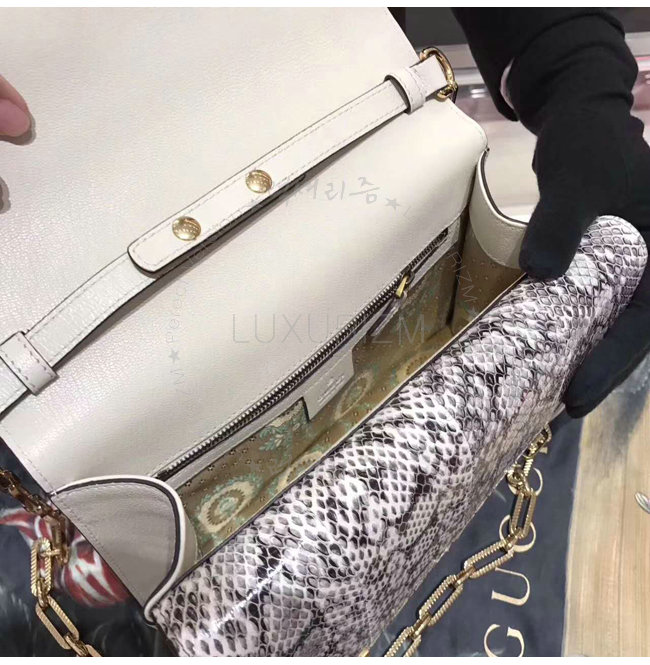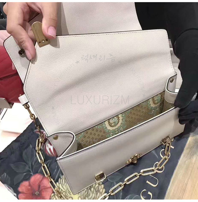 오버래핑 더블 플랩 잠금장치 각각 Gucci 및 Loved 문구가 새겨진 펠린 헤드 디테일의 클래스프