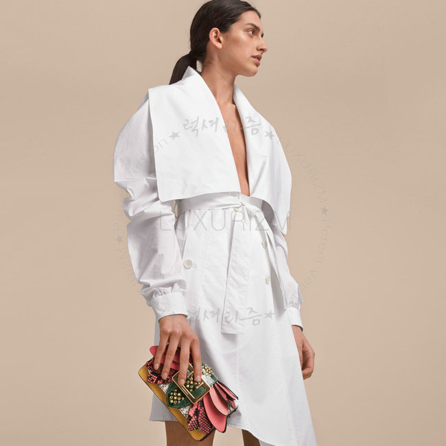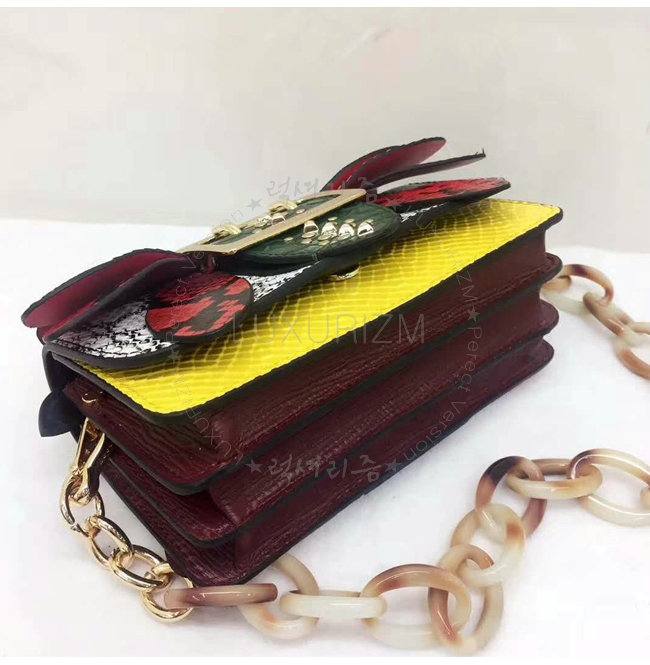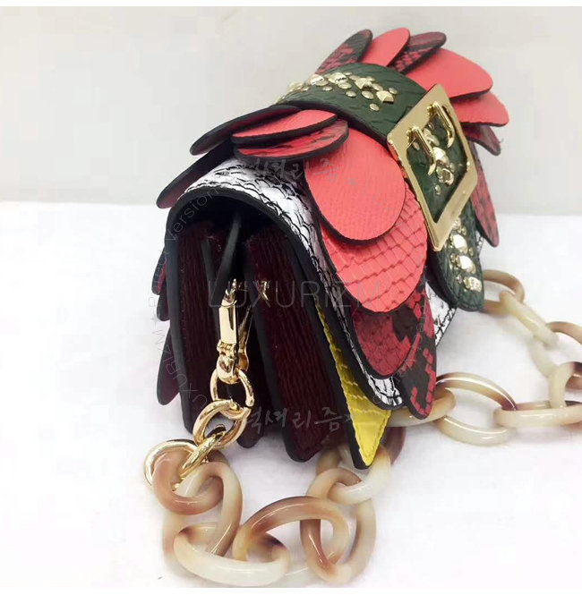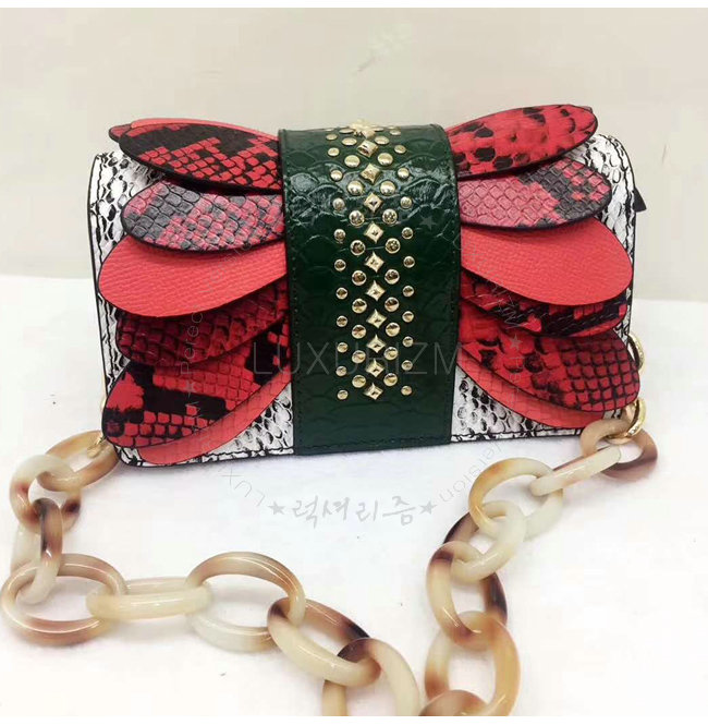 수작업으로 완성된 리벳 장식 아플리케가 돋보이는 스네이크스킨과 가죽 소재의 스몰