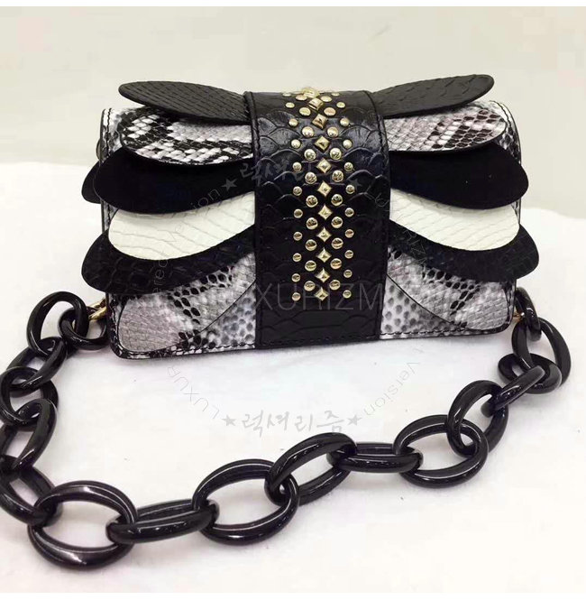 수작업으로 완성된 리벳 장식 아플리케가 돋보이는 스네이크스킨과 가죽 소재의 스몰