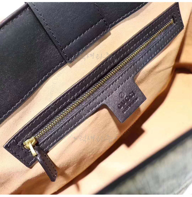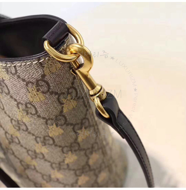 벌 모양의 골드 프린트 베이지/에보니 GG 수프림 블랙 가죽 트리밍 내부 지퍼 및