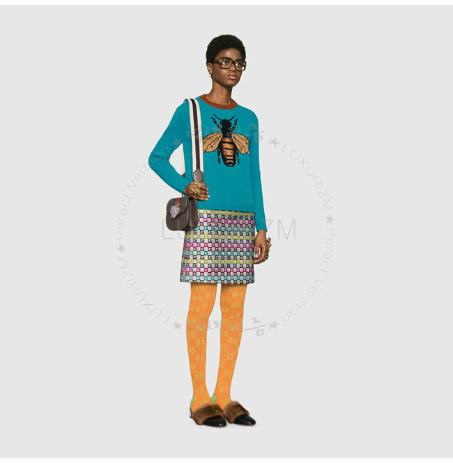 크리스탈 장식 모티브 및 시그니처 Web스트라이프 디테일.구찌 자카드 스트라이프 숄더스트랩 장식.