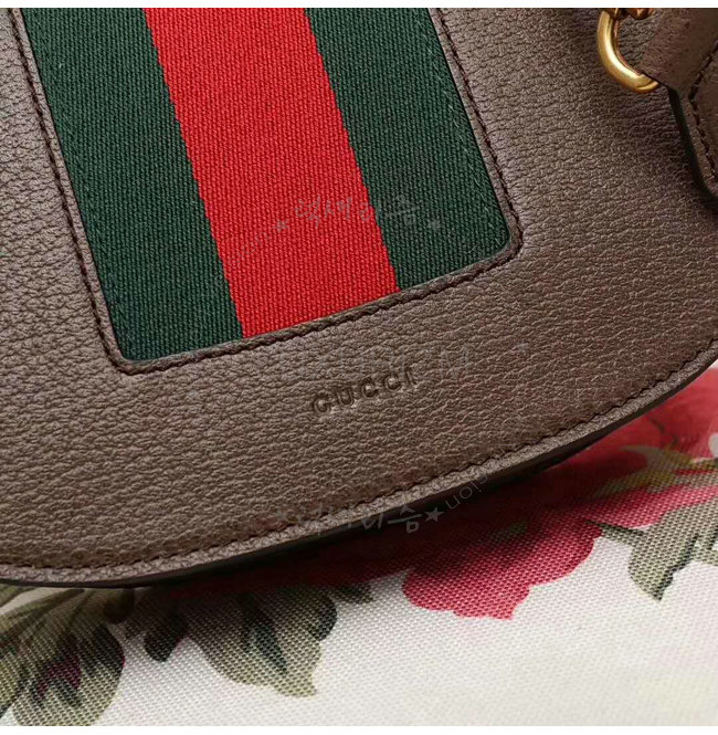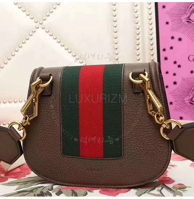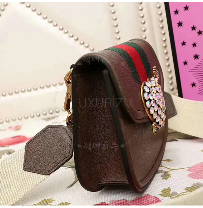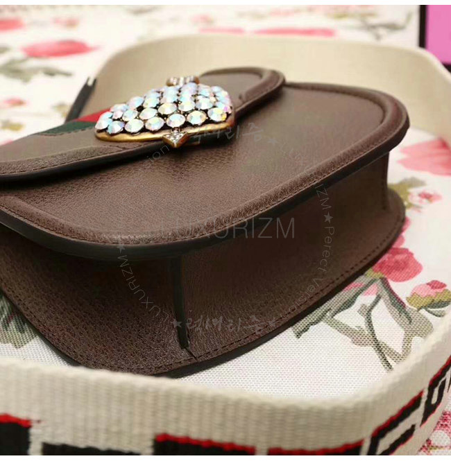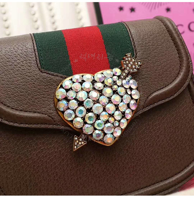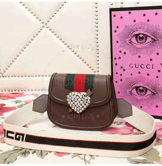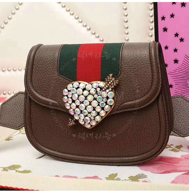 브라운 가죽 그린/레드 Web디테일 구멍뚫린 하트메탈 크리스탈 구찌 자카드