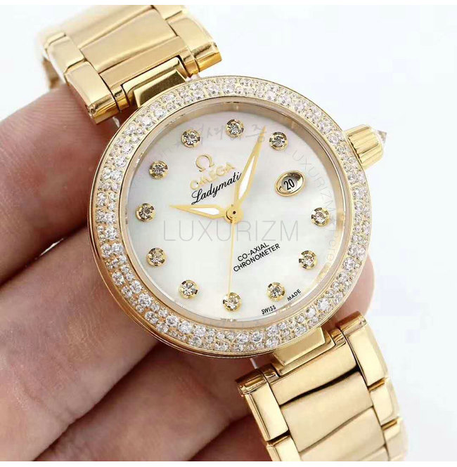 [스페셜오더]OMEGA-오메가 드 빌 레이디매틱 옐로우 골드 다이아 화이트 자개다이얼 레이디스 워치 34mm