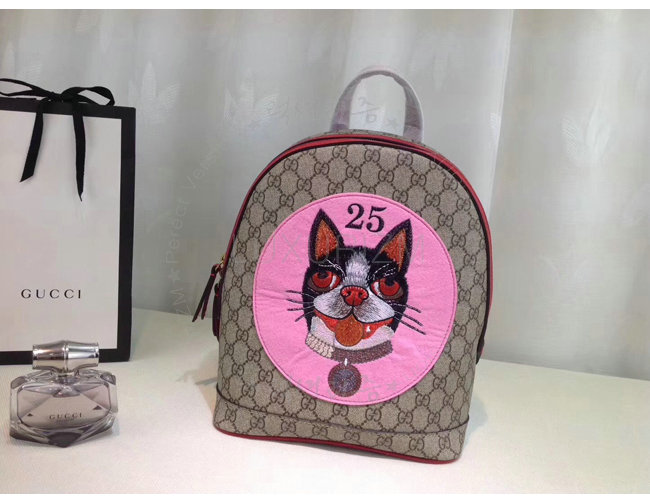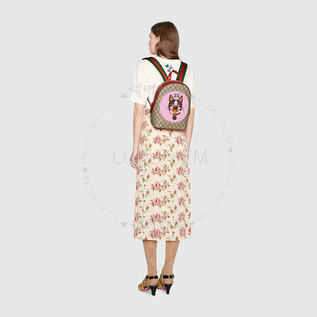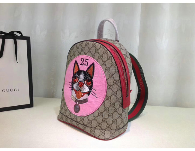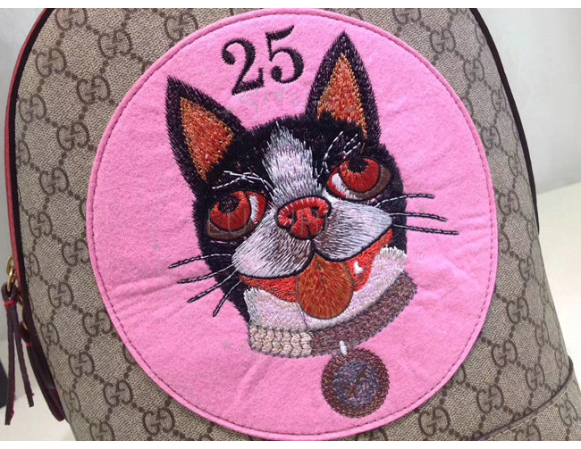 GG 수프림 백팩. 보스턴 테리어 보스코 스웨이드 자수 패치. 개의 해를 맞이하여