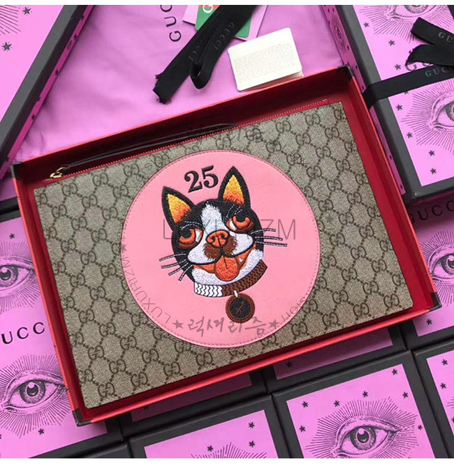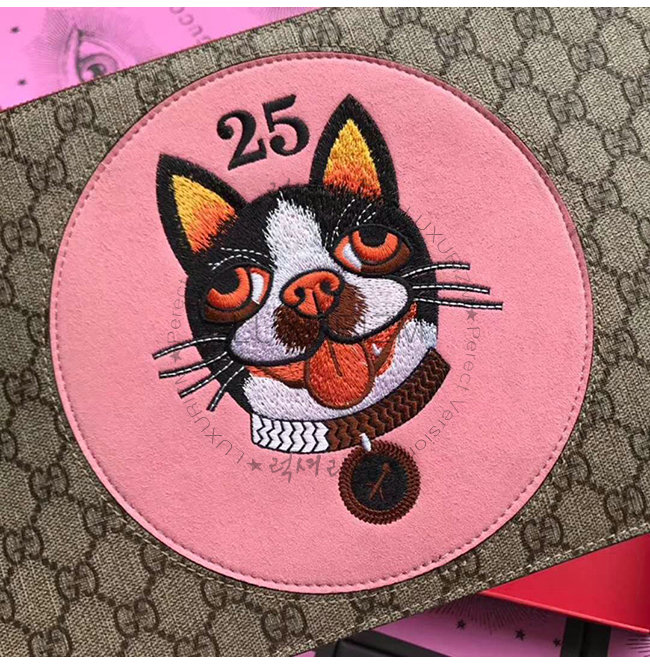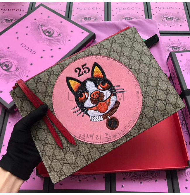 GG 슈프림 파우치. 보스턴 테리어 보스코 이미지 스웨이드 자수 패치. 개의 해를