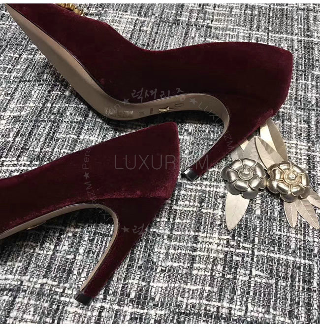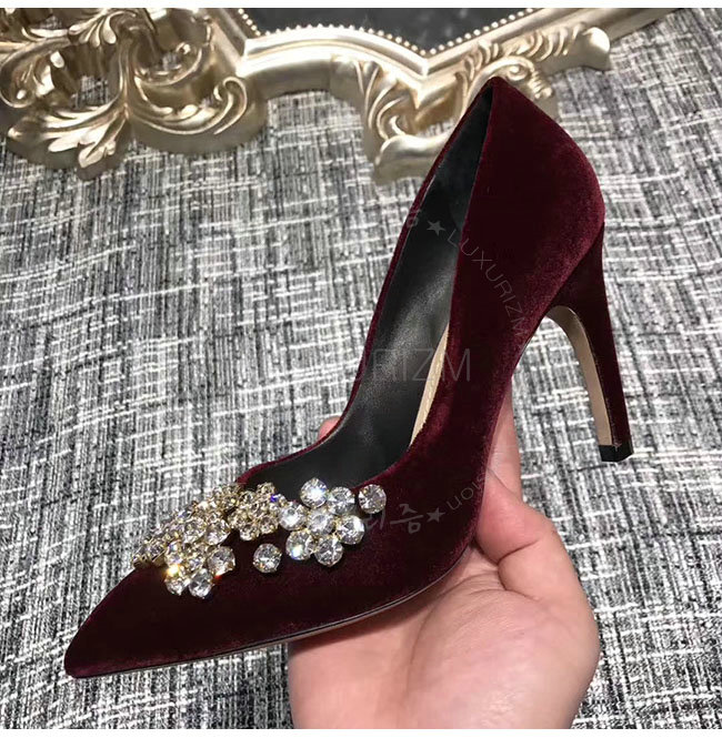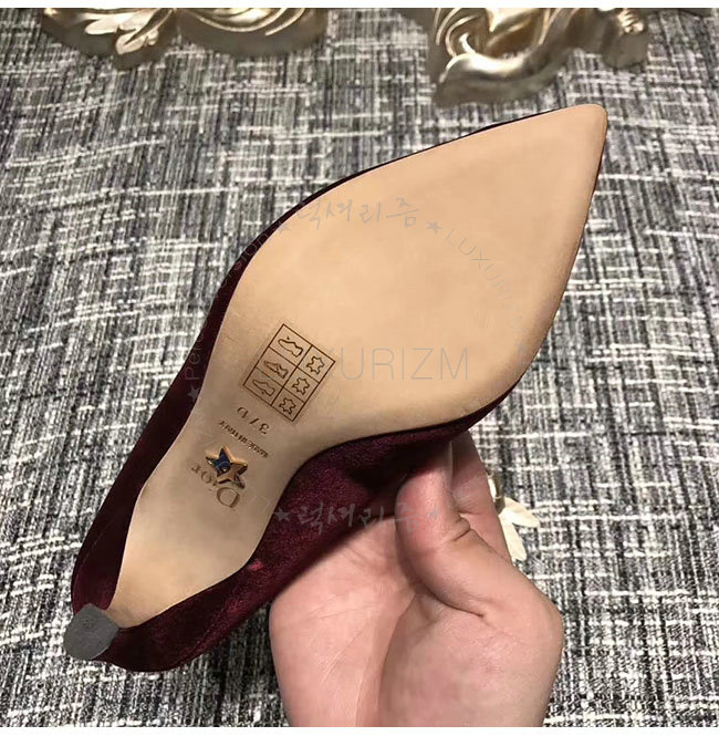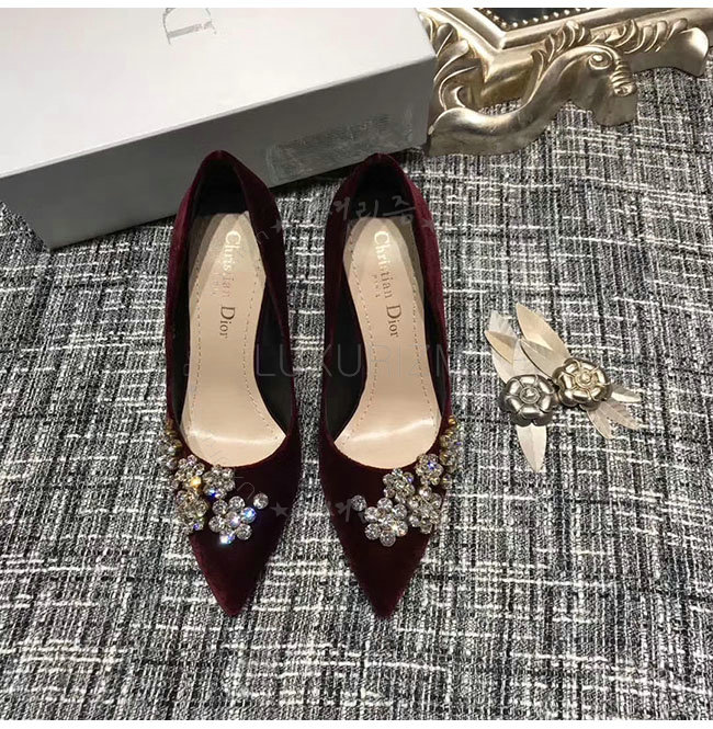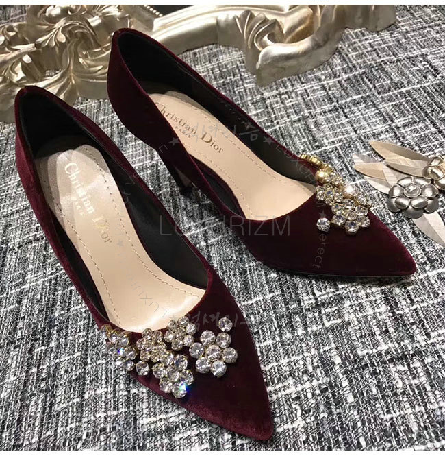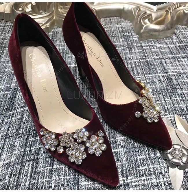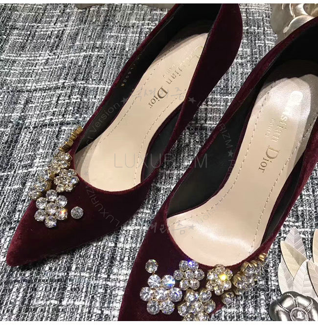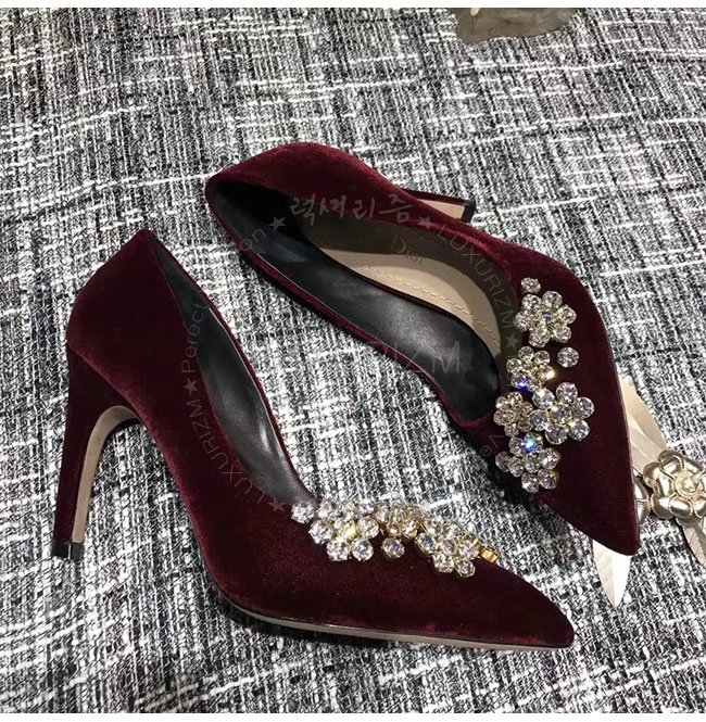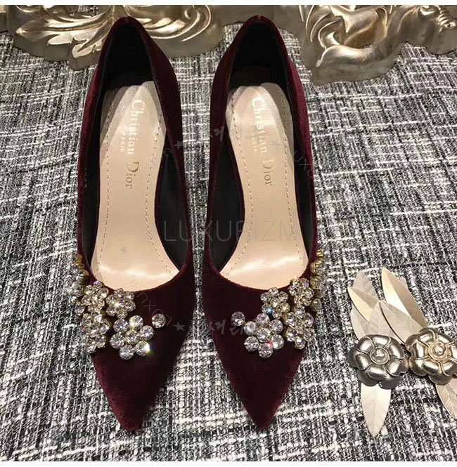 DIOR-KCP345 디올 버건디 벨벳 라인스톤 펌프스 여성용