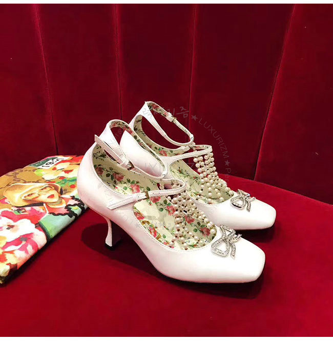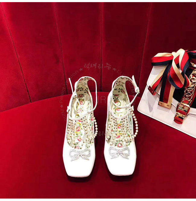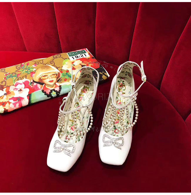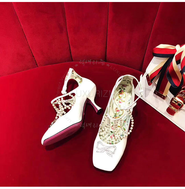 GUCCI-488662 9022 구찌 펄 디테일의 T 스트랩 화이트 가죽 펌프스