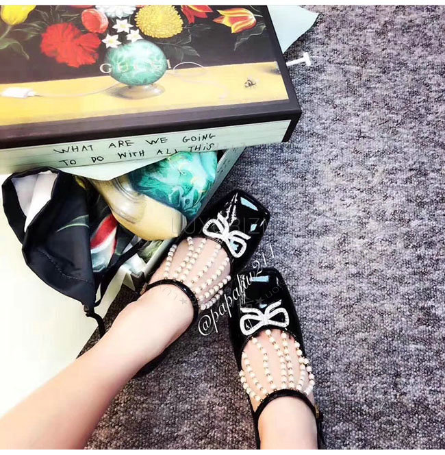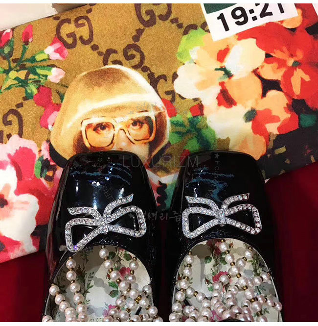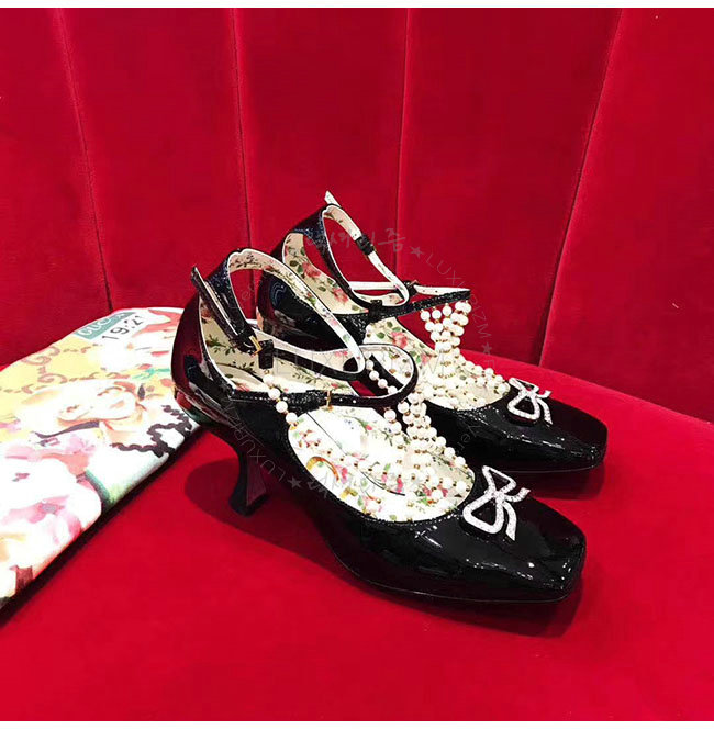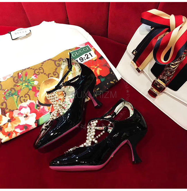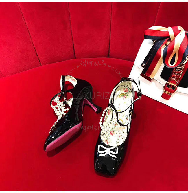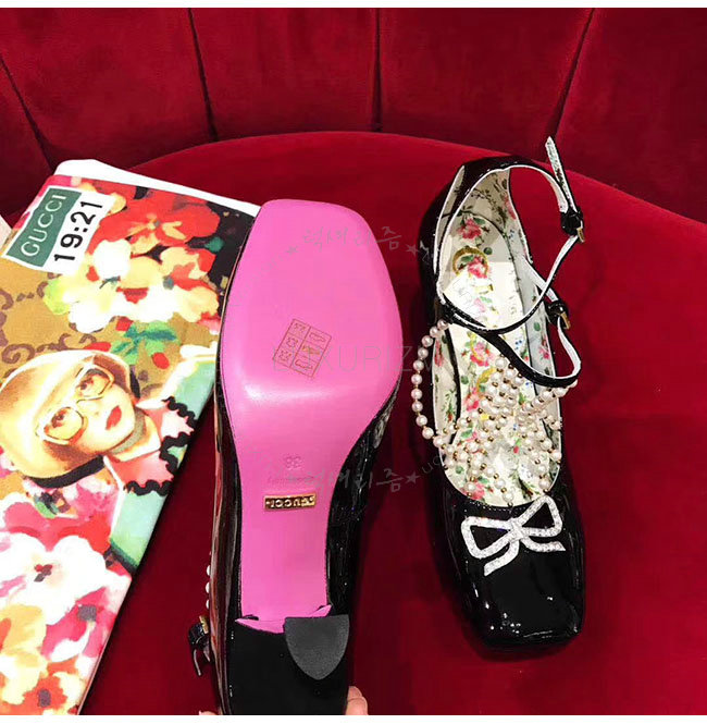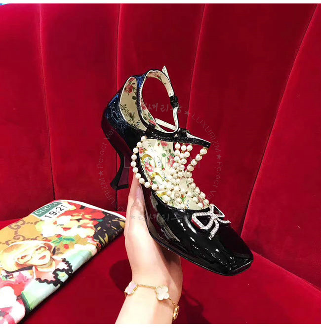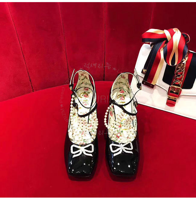 GUCCI-488662 1000 구찌 펄 디테일의 T 스트랩 블랙 가죽 펌프스