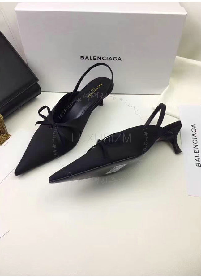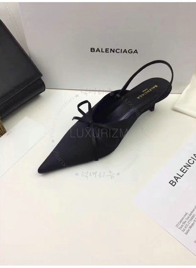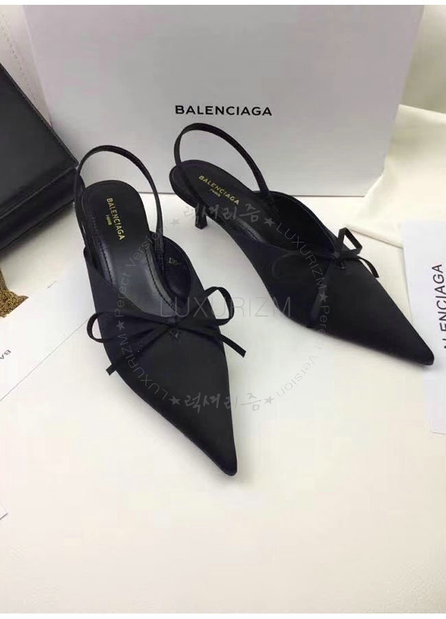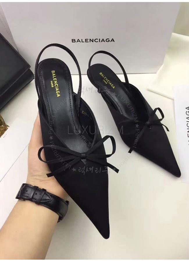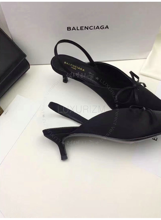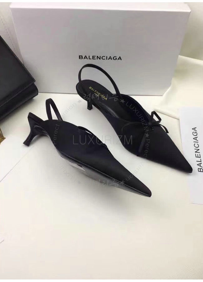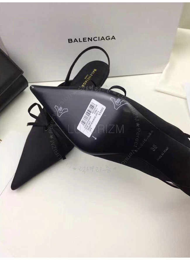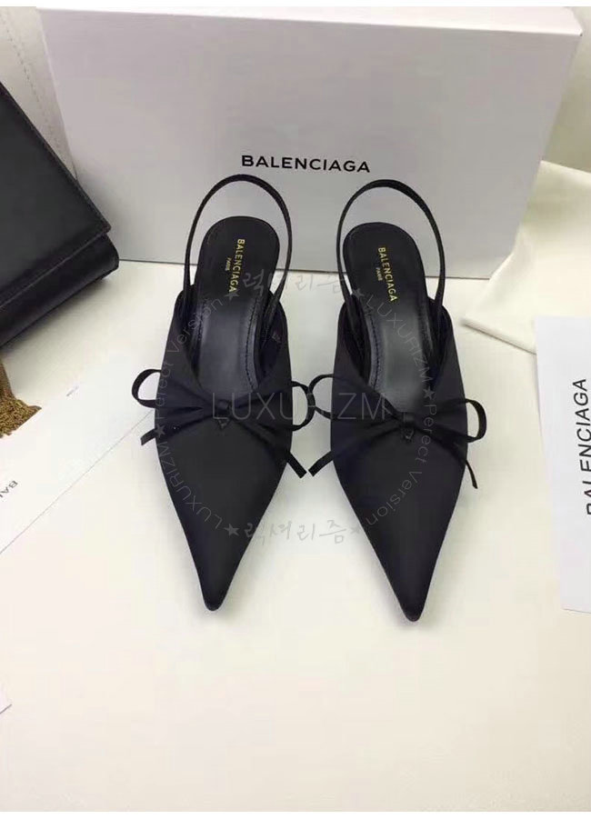 BALENCIAGA-500618 발렌시아가 블랙 키튼 힐 디테일의 포인티드 토우 새틴 나이프 뮬 여성용