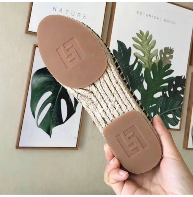 코드와 러버 솔이 장식된 에스파드리유. 나파 라이닝.블록 패브릭 소재 대비를 이루는