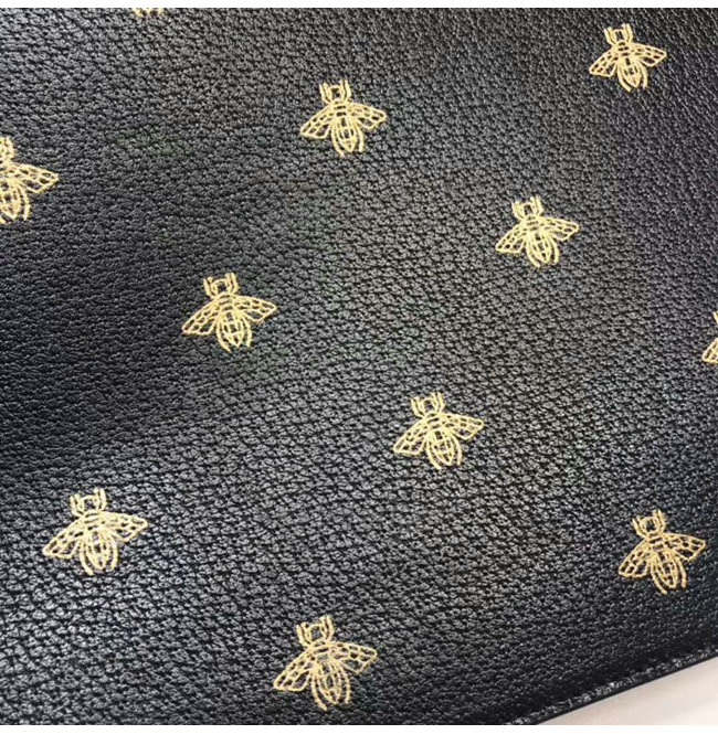 골드 벌과 별 모양 프린트 블랙 가죽 내부 지퍼 포켓 뒷면에 가죽핸들 조절