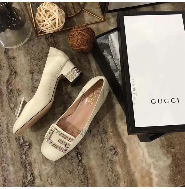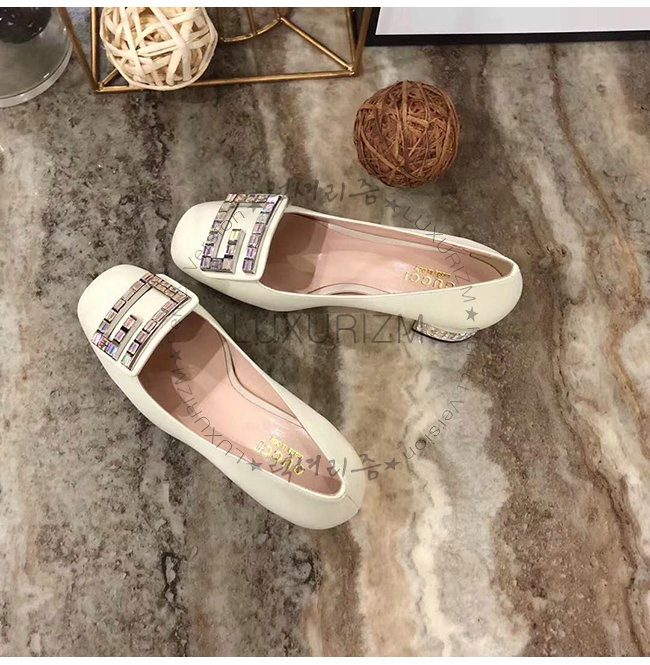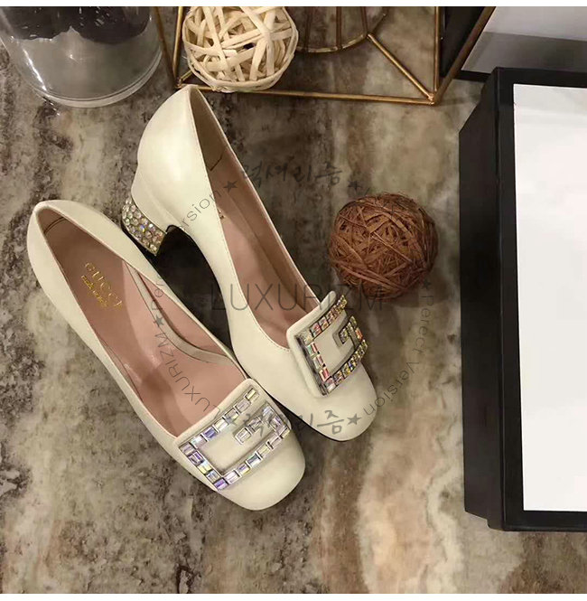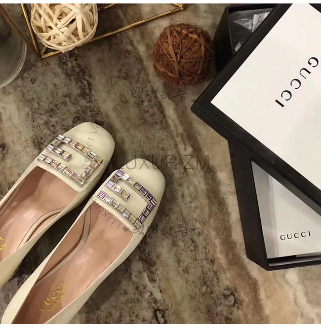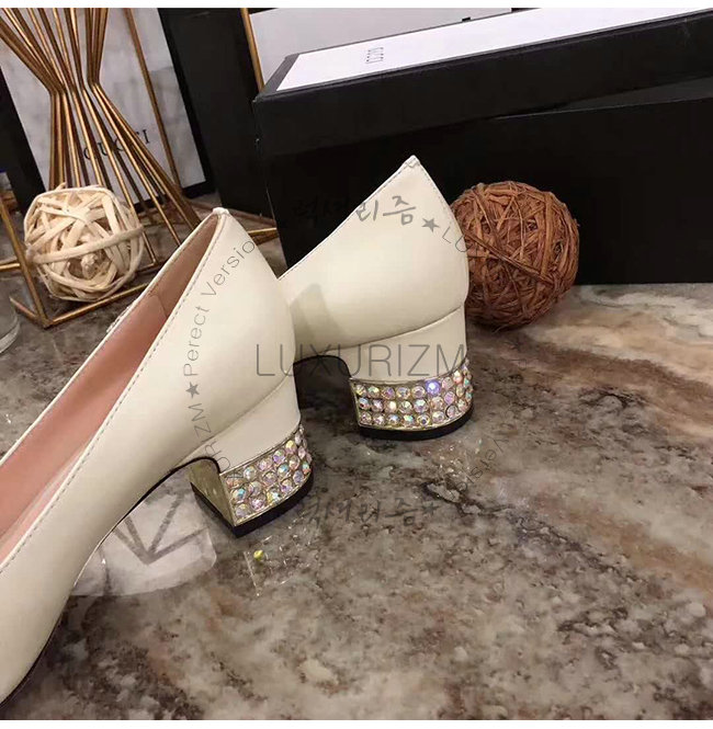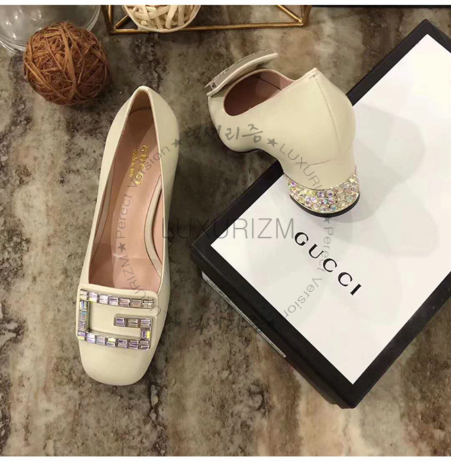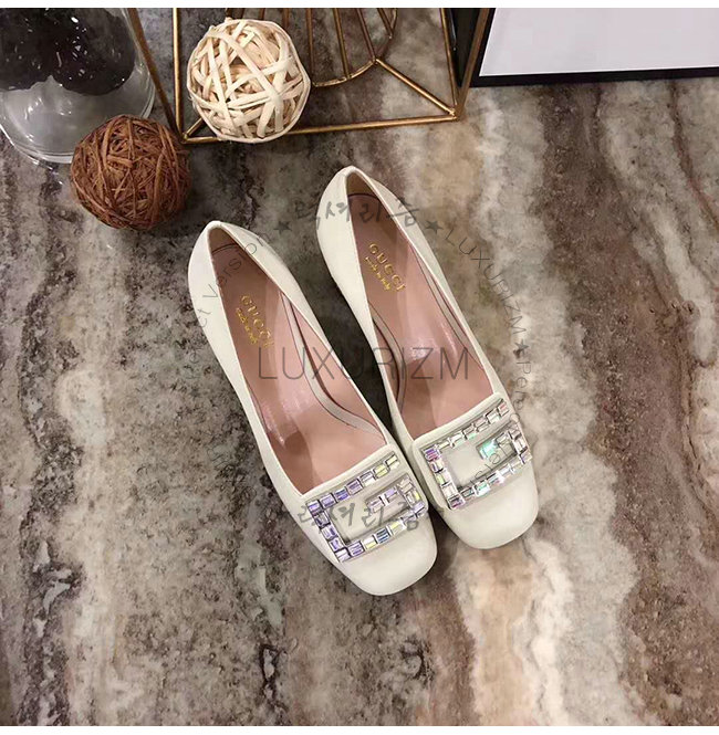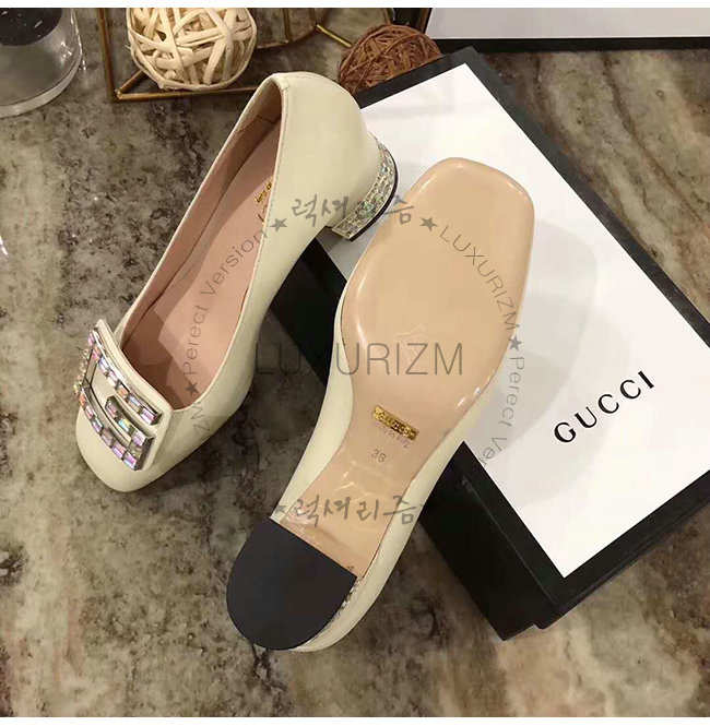 GUCCI-522697 9526 구찌 빈티지 화이트 가죽 크리스털 G 장식 미드힐 펌프스