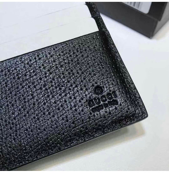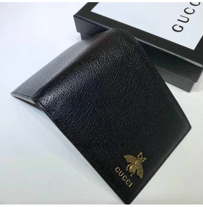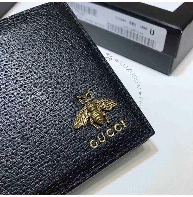 블랙 가죽 앤틱 골드 톤 메탈 장식 메탈 벌 모양 구찌 로고 8개의 카드 슬롯 및 2개의 지폐 컴파트먼트.