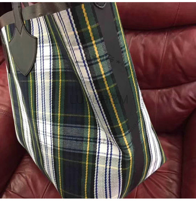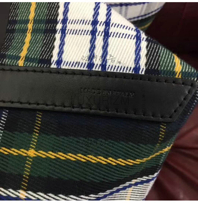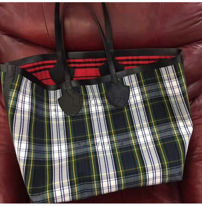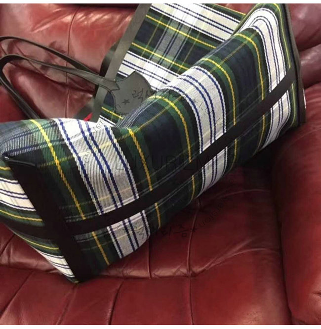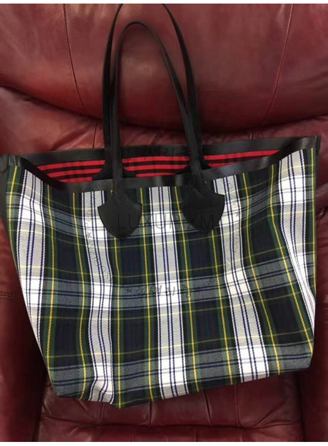 타탄 체크 패턴이 돋보이는 양면 디자인의 오버사이즈 토트. 접착면 소재로 제작된