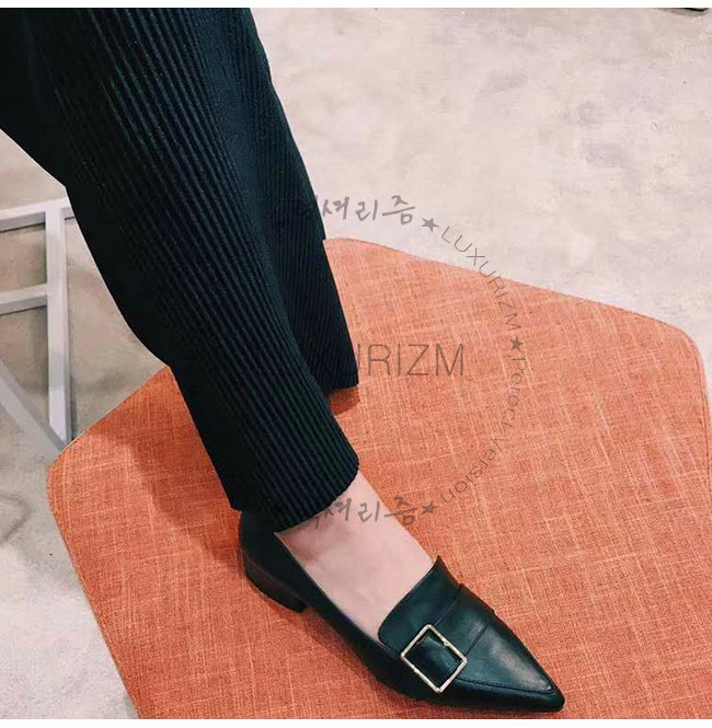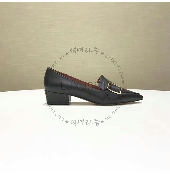 하루미 펌프는 송아지 가죽으로 만들어졌으며 얇고 직사각형의 버클 디테일이 특징입니다.