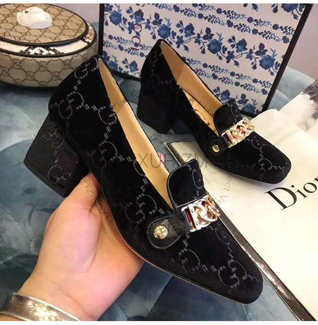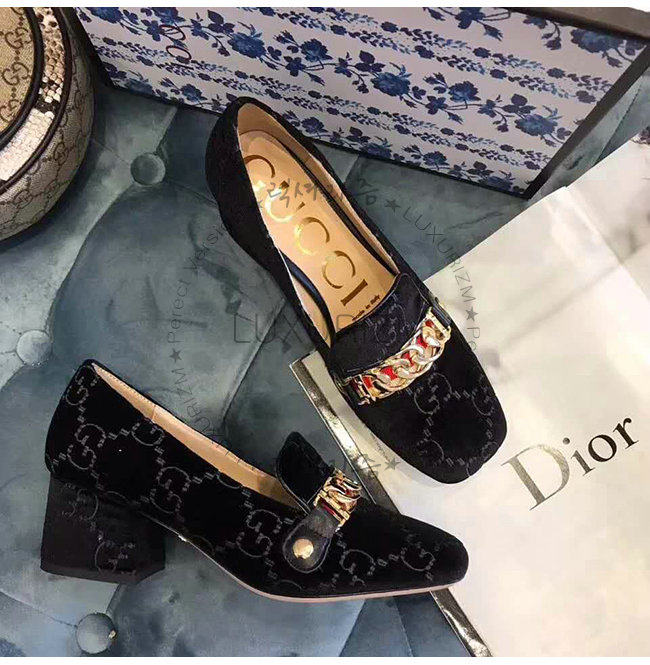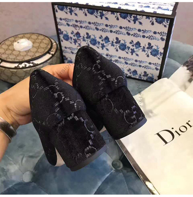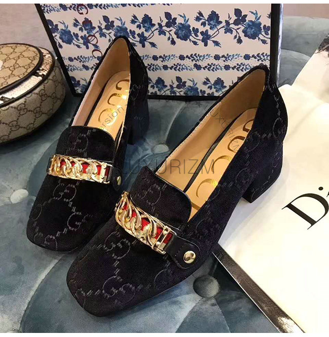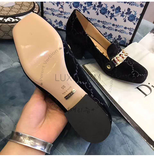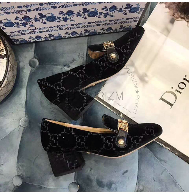 GUCCI-525082 1071 구찌 Sylvie 블랙 GG 벨벳 미드힐 펌프스