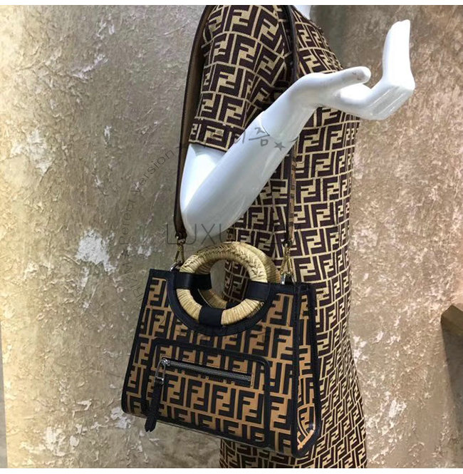 송아지 가죽 소재. 볼록한 아이코닉 FF 패턴 프린트. 우븐 라탄 핸들. 팔라듐 피니싱 메탈웨어.