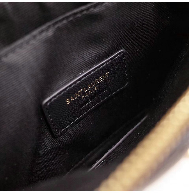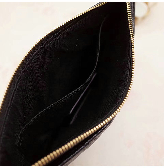중앙의 메탈 인터레이스드 YSL 이니셜과 퀼티드 오버스티칭 디테일의 지퍼 클러치.