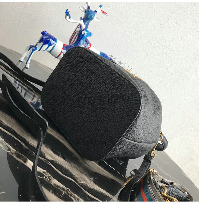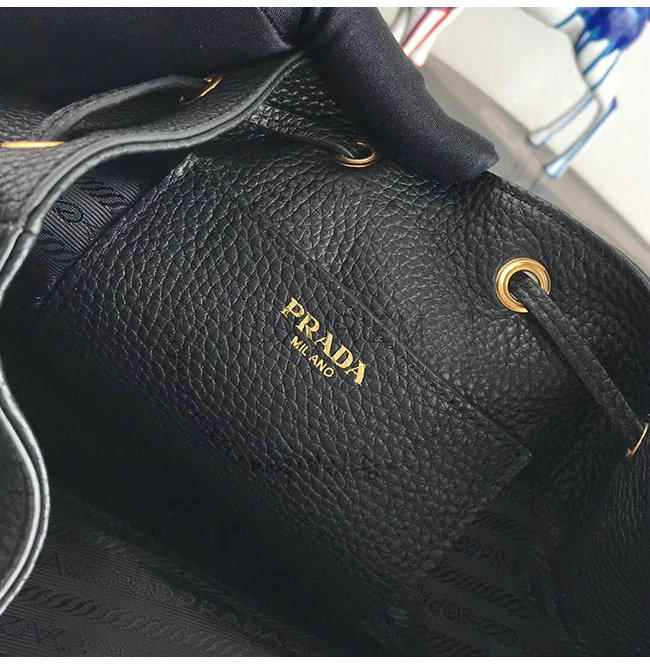 로고 상단에 가죽 드로스트링 잠금 프라다 로고 라이닝 내부 가죽 포켓 1개.