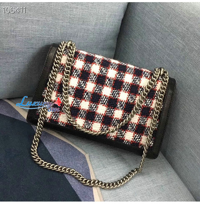 화이트/히비스커스 레드/블루 체크 트위드 블랙 가죽