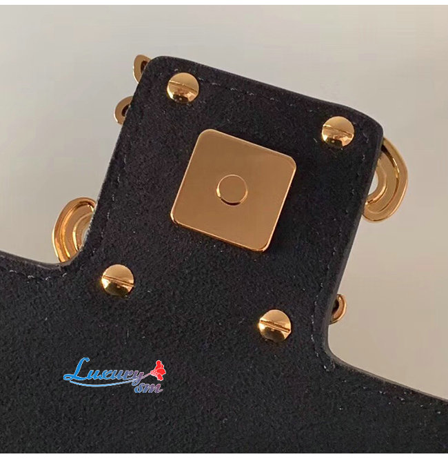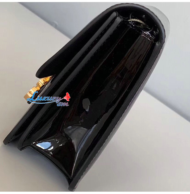 페이턴트 가죽 소재, 골드 피니싱 메탈웨어.