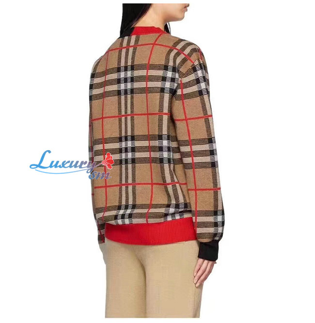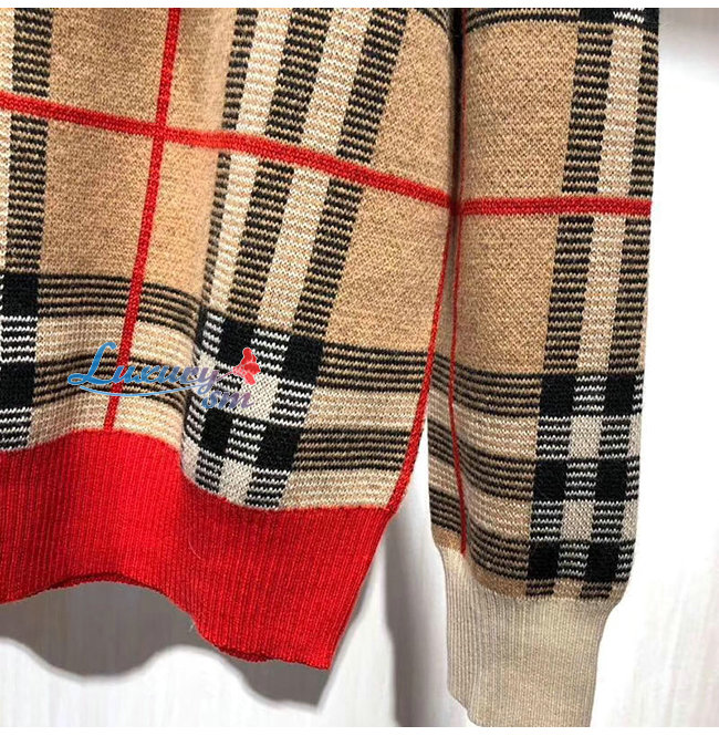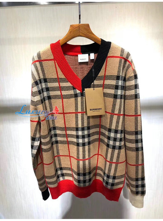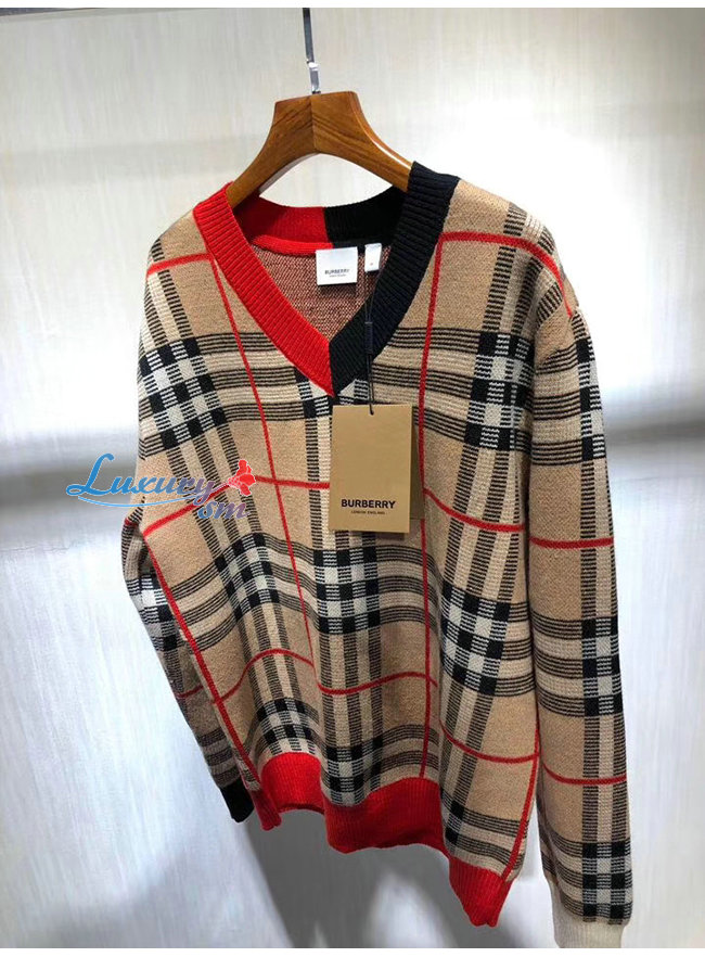 BURBERRY-80236641 버버리 체크 메리노 울 자카드 브이넥 스웨터