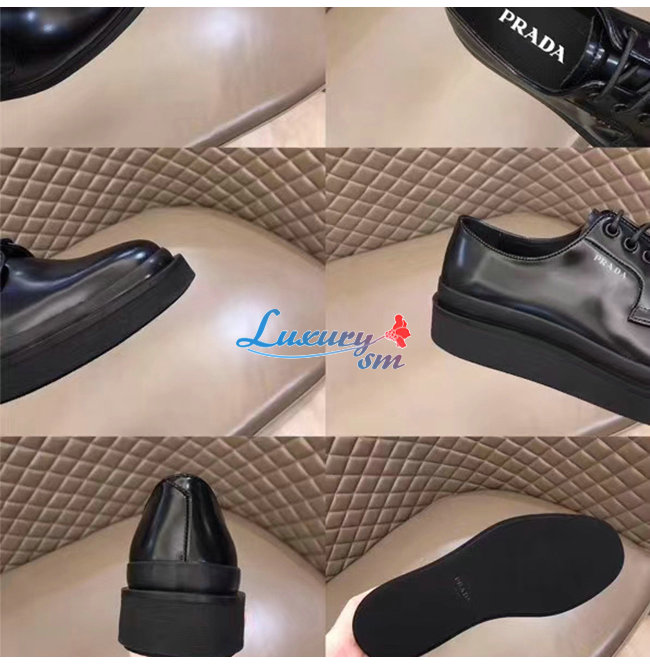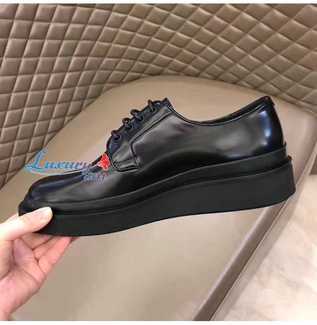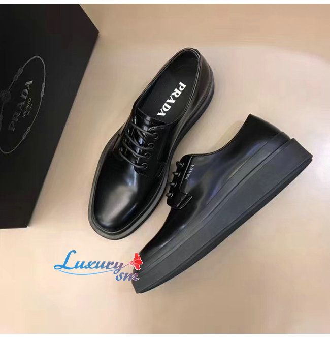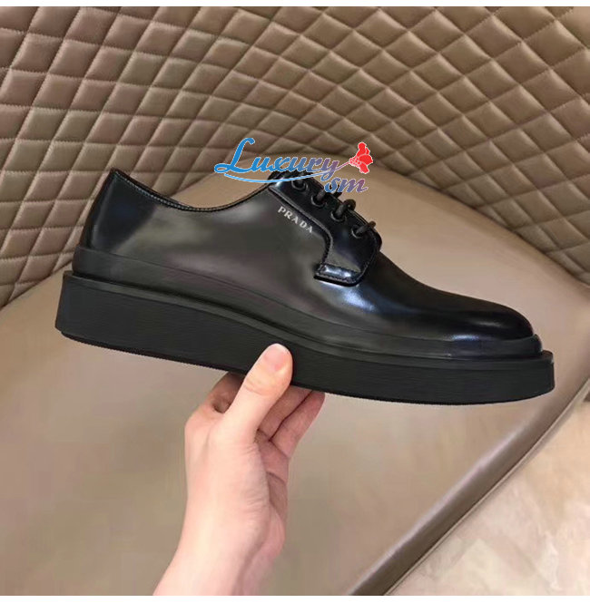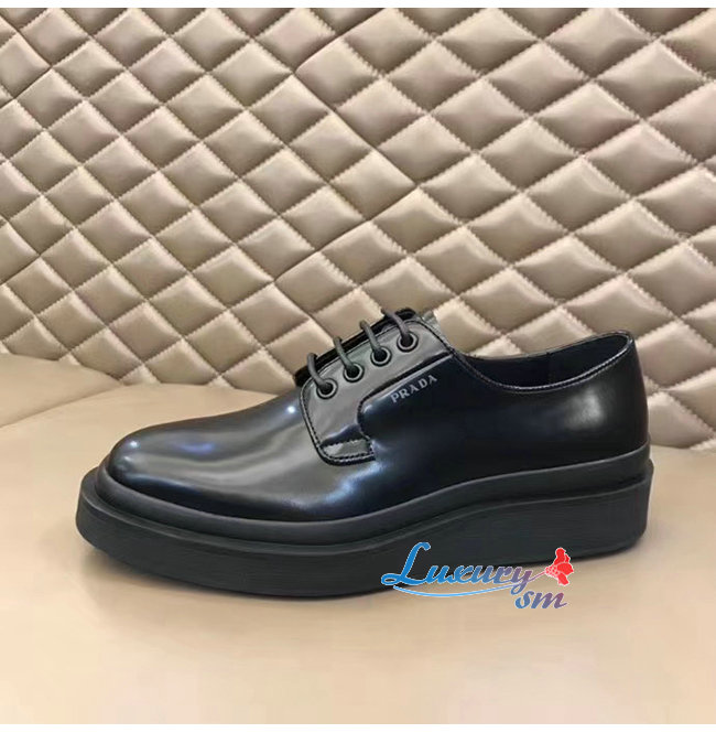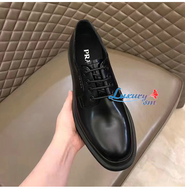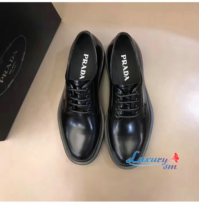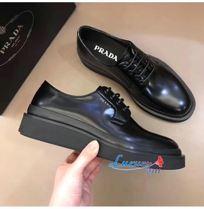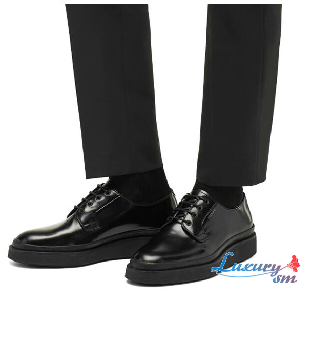 PRADA-2EE311 프라다 블랙 카프스킨 스크린 프린트 로고 더비 슈즈