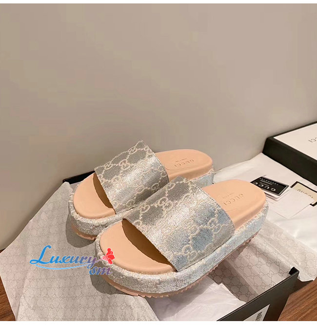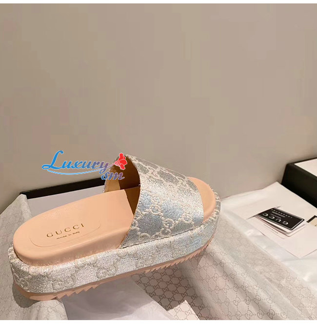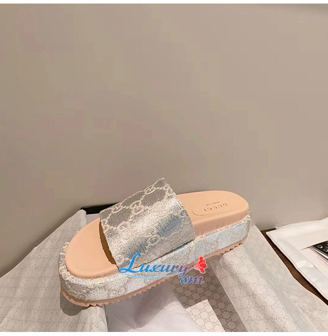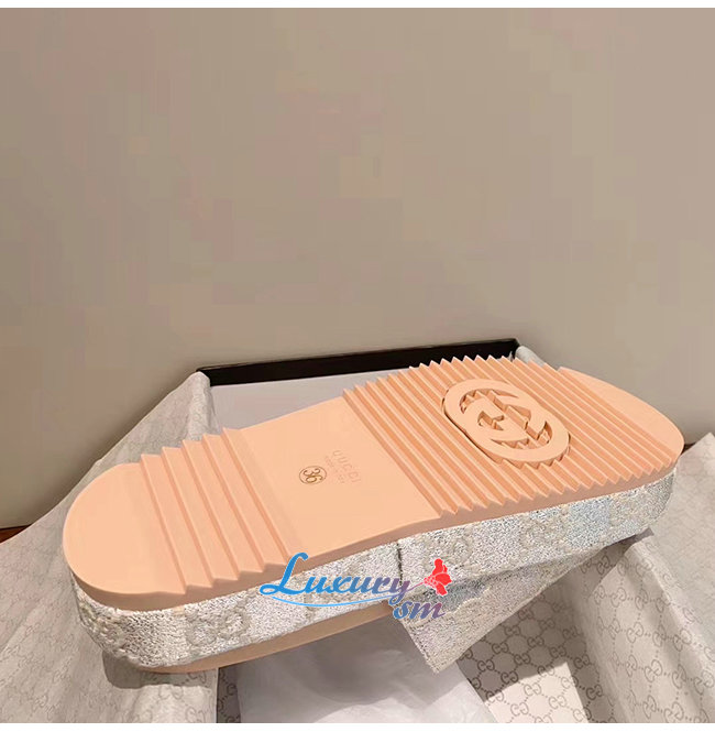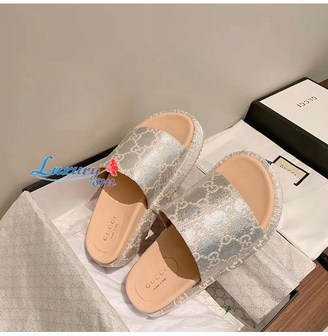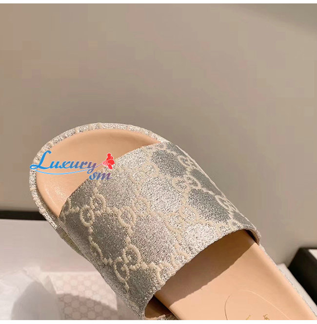 GUCCI-623212 1066 구찌 실버/베이지 헤리티지 GG 라메 슬라이드 샌들
