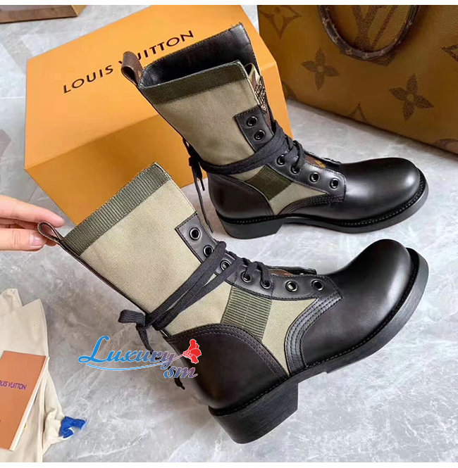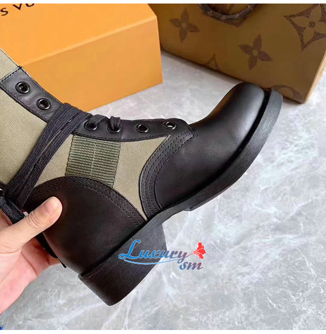 카키 색상의 캔버스와 블랙색상의 송아지 가죽소재