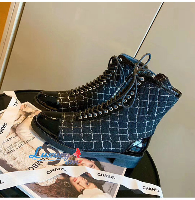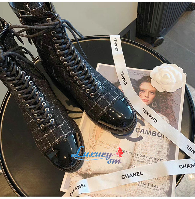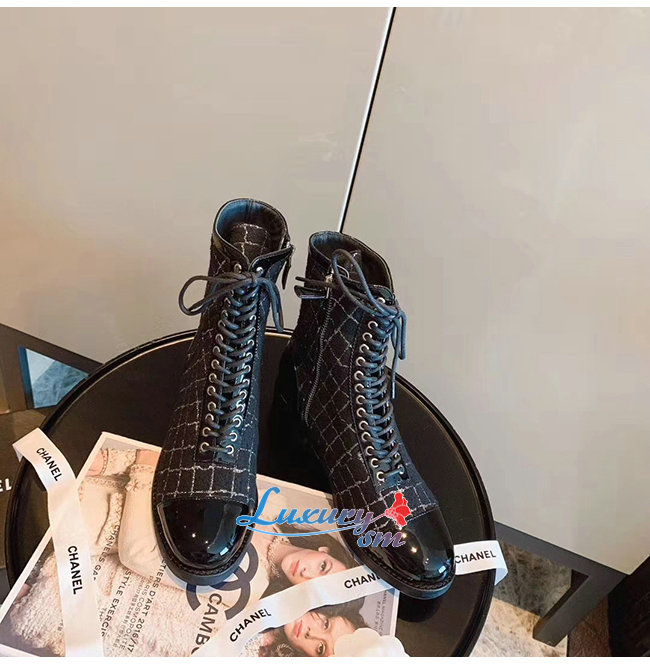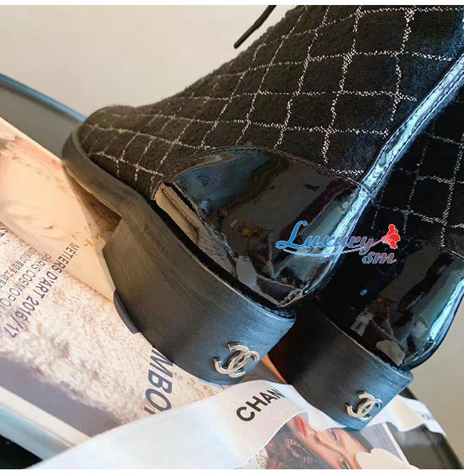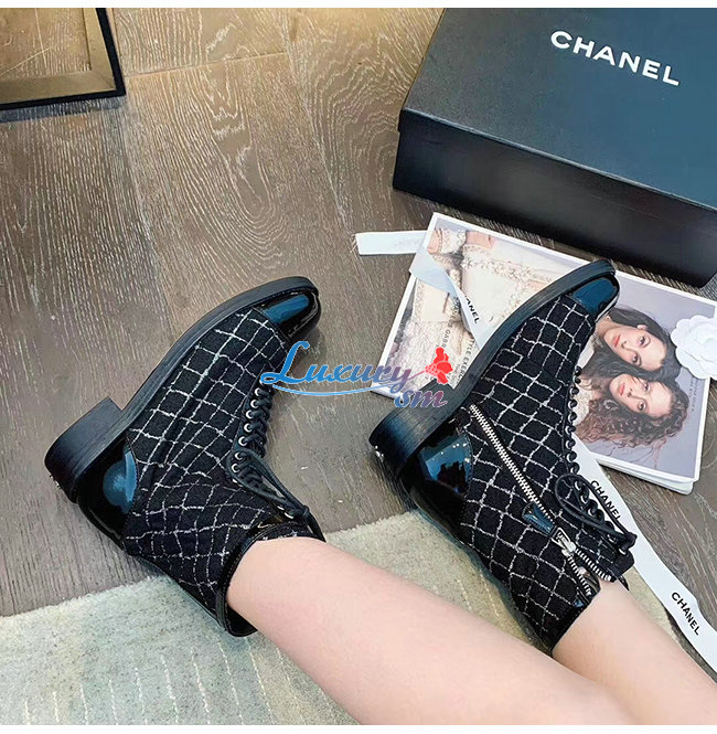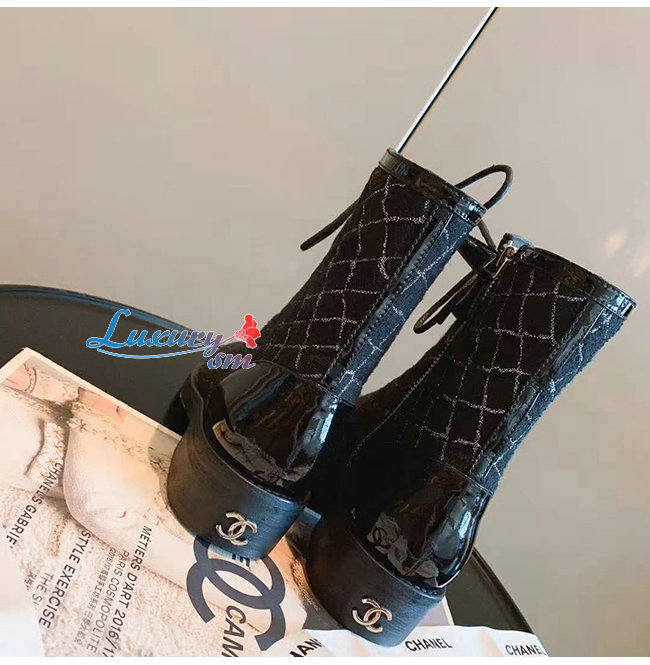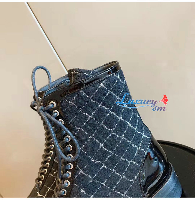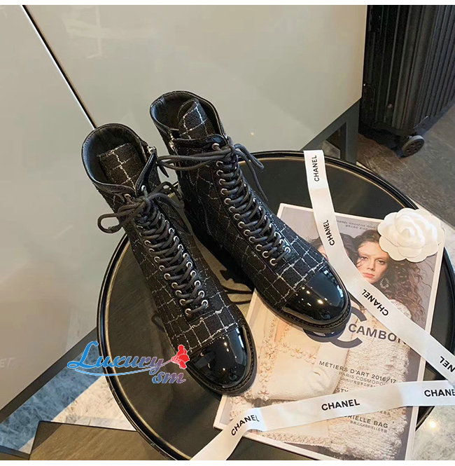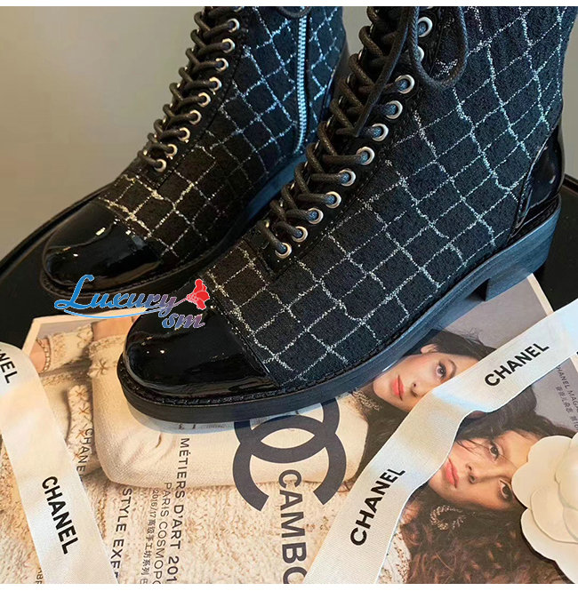 CHANEL-G36209 샤넬 블랙 트위드 페이턴트 카프스킨 쇼트 부츠