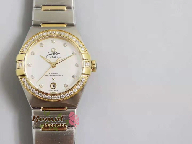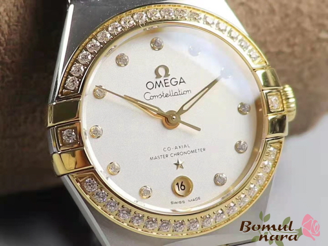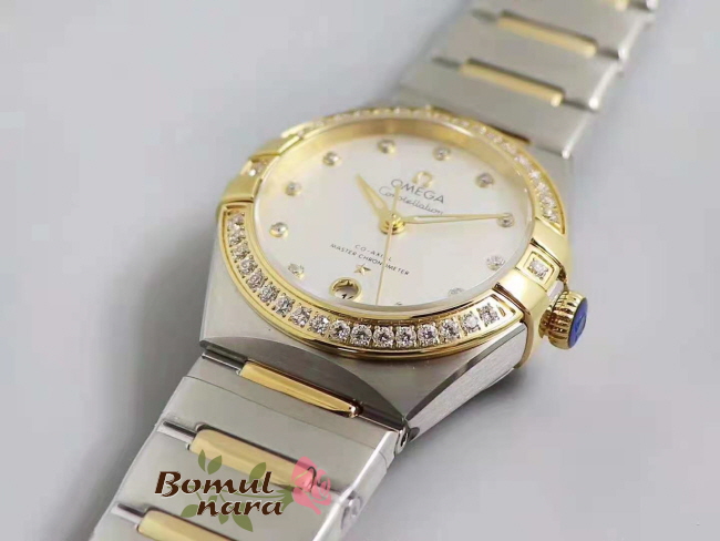 [스페셜오더]OMEGA-오메가 컨스텔레이션 옐로우 골드 다이아 베젤 스틸 실버 여자시계 29mm