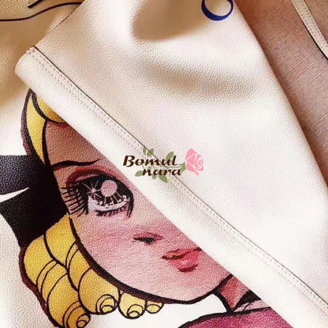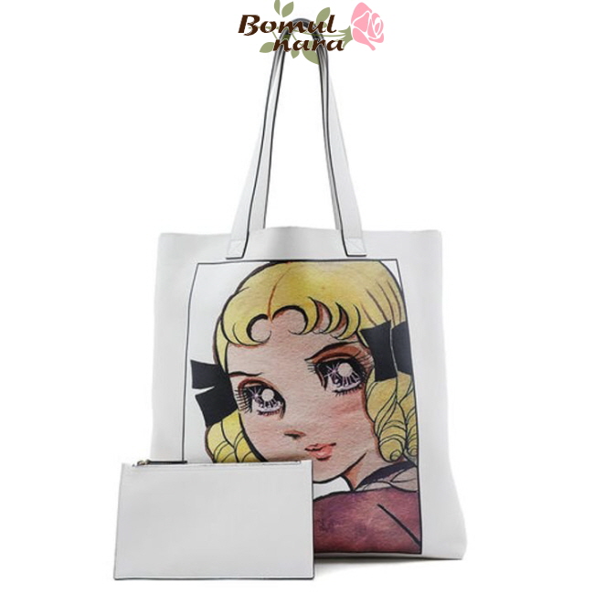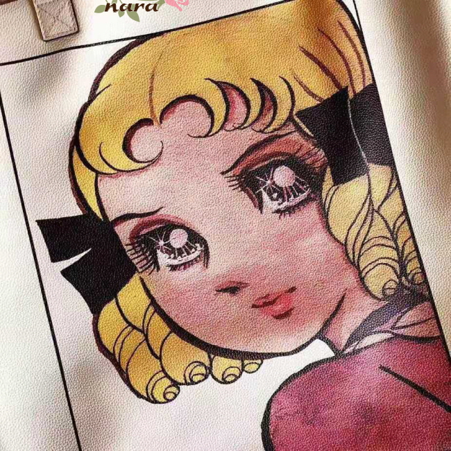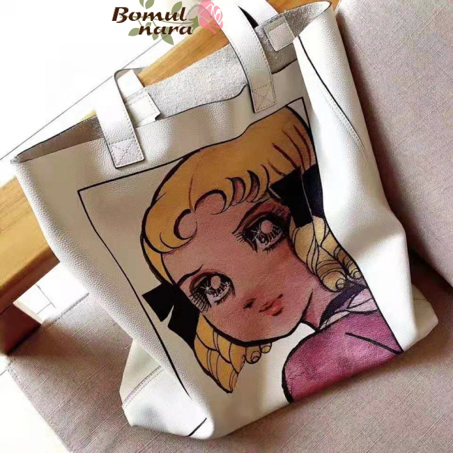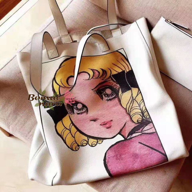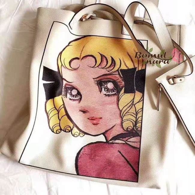 토트 백 앞면에 캔디 삽화와 뒷면 블루 GUCCI 로고