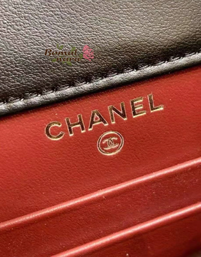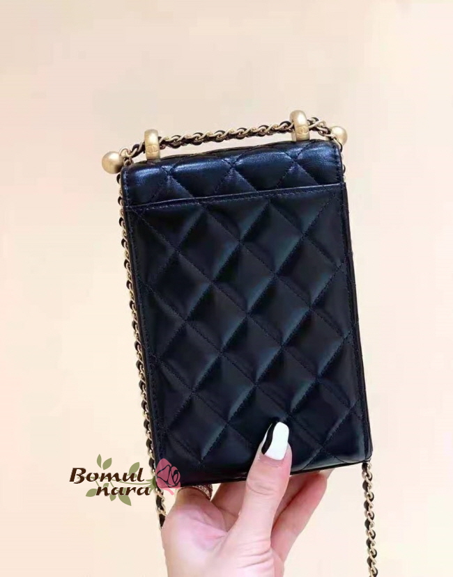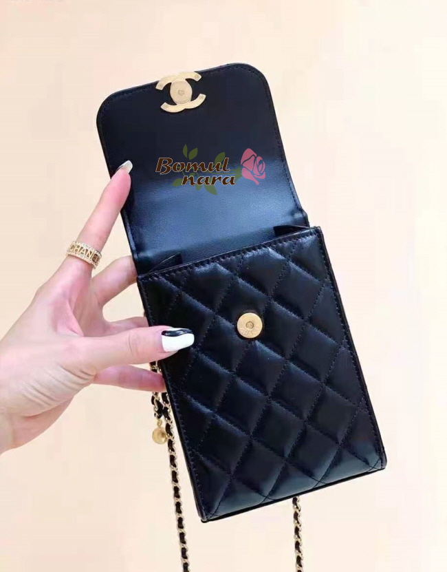 체인달린 미니백으로 체인 끝 샤넬각인이 새겨진