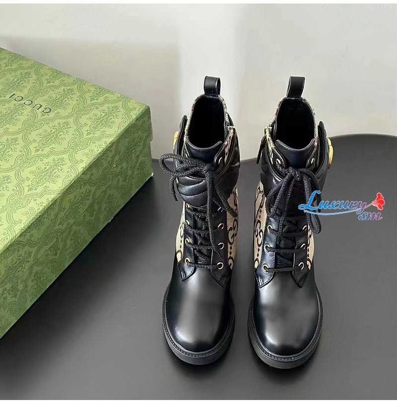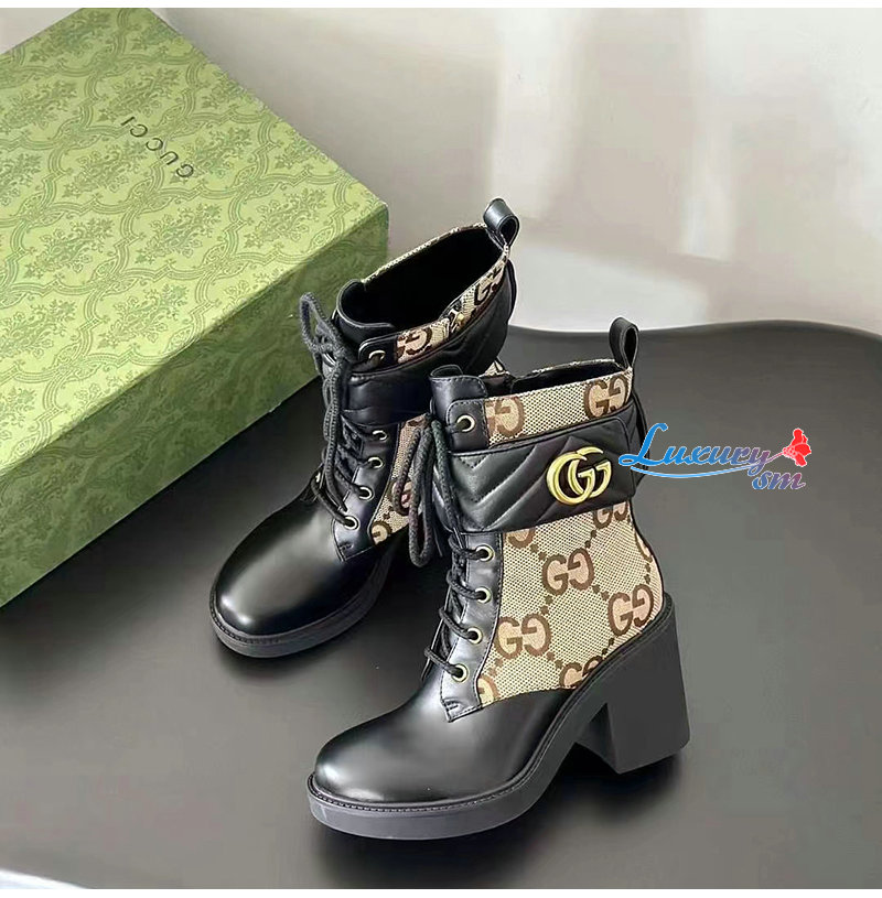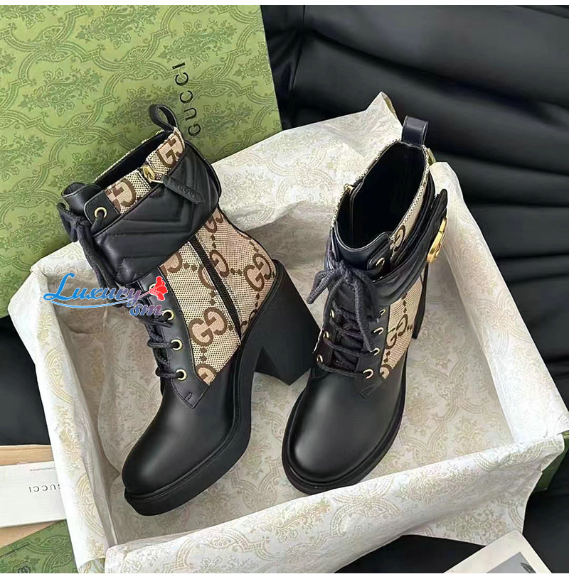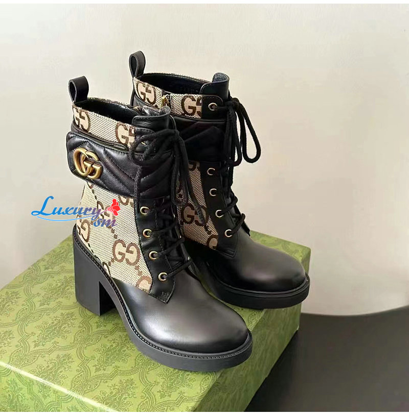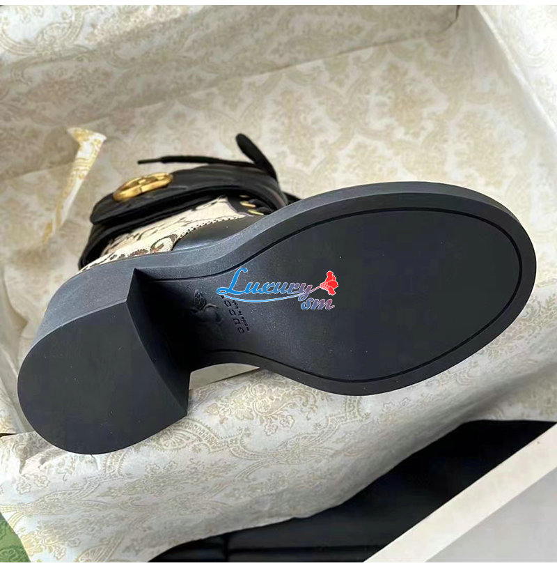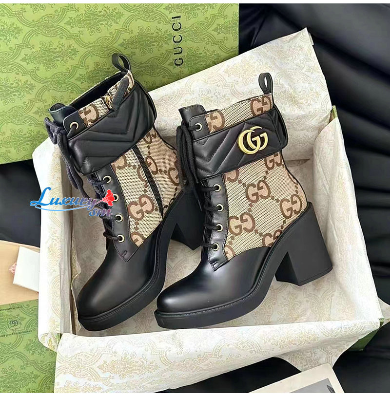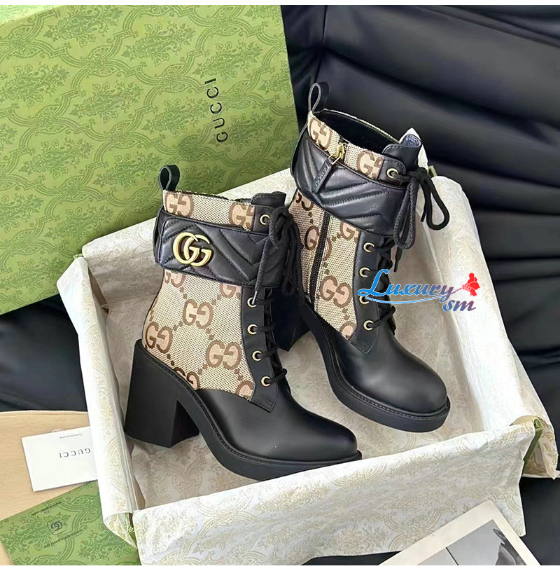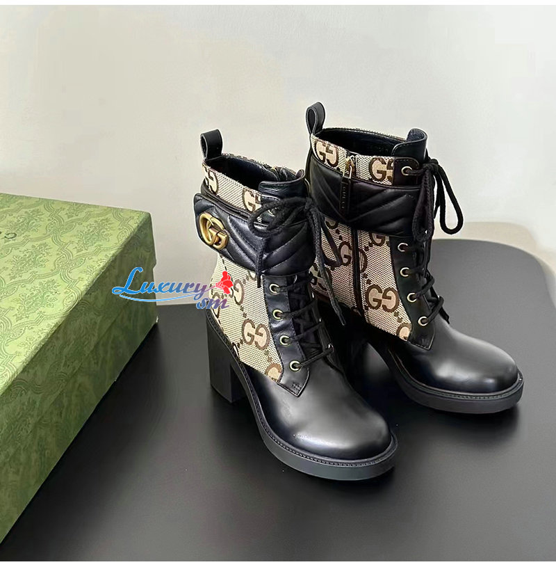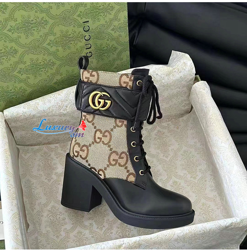 GUCCI-678984 1284 구찌 베이지/블랙 GG 캔버스 더블 G 앵클 부츠 여성용