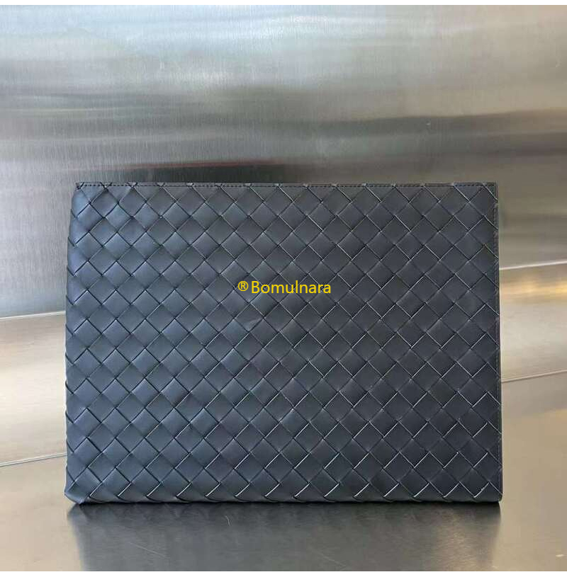 가죽 소재를 인트레치아토 위빙으로 완성한 파우치.