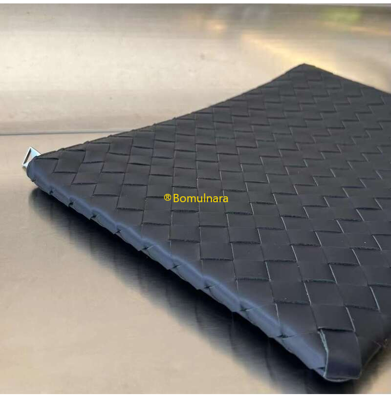 가죽 소재를 인트레치아토 위빙으로 완성한 파우치.