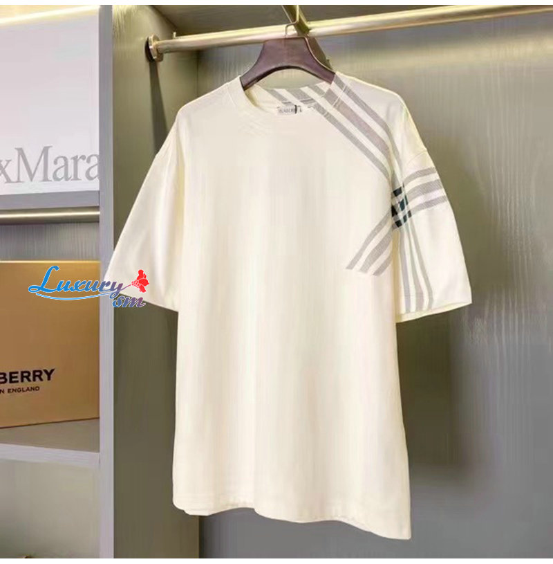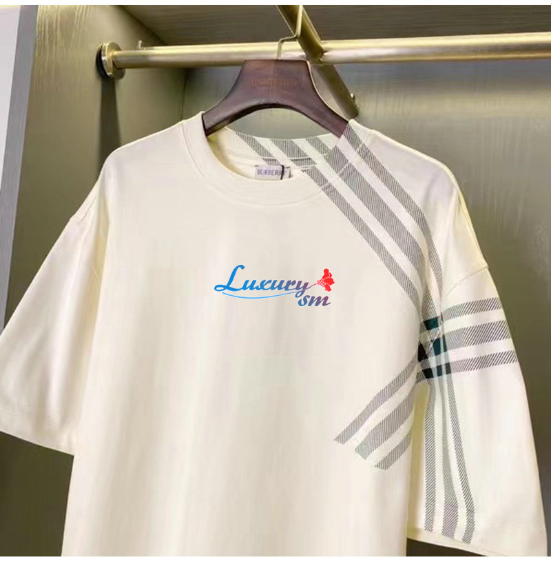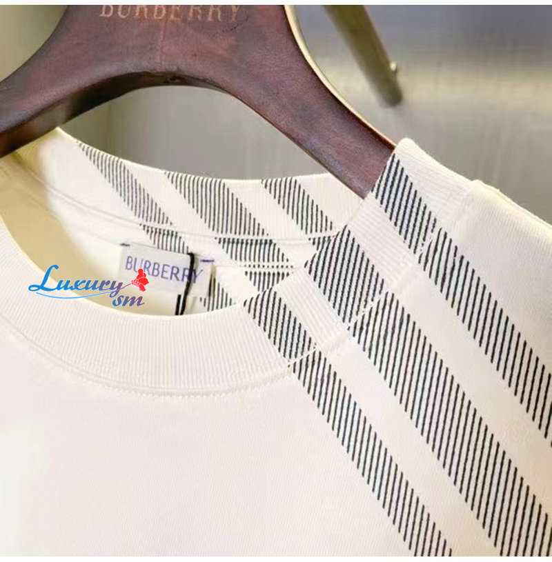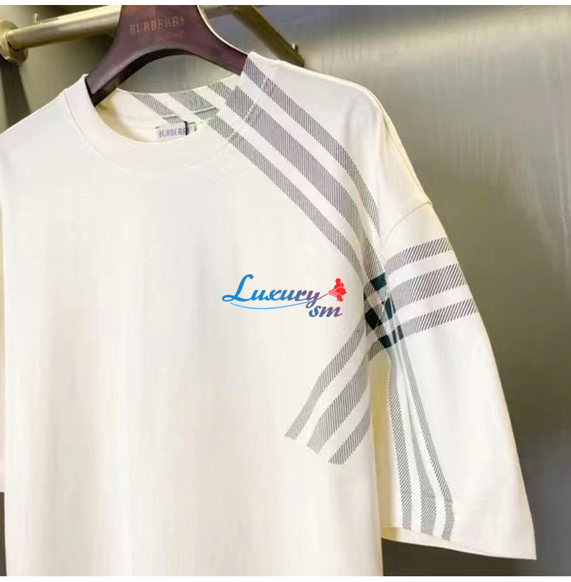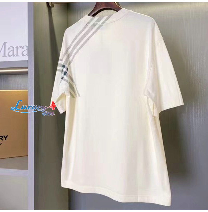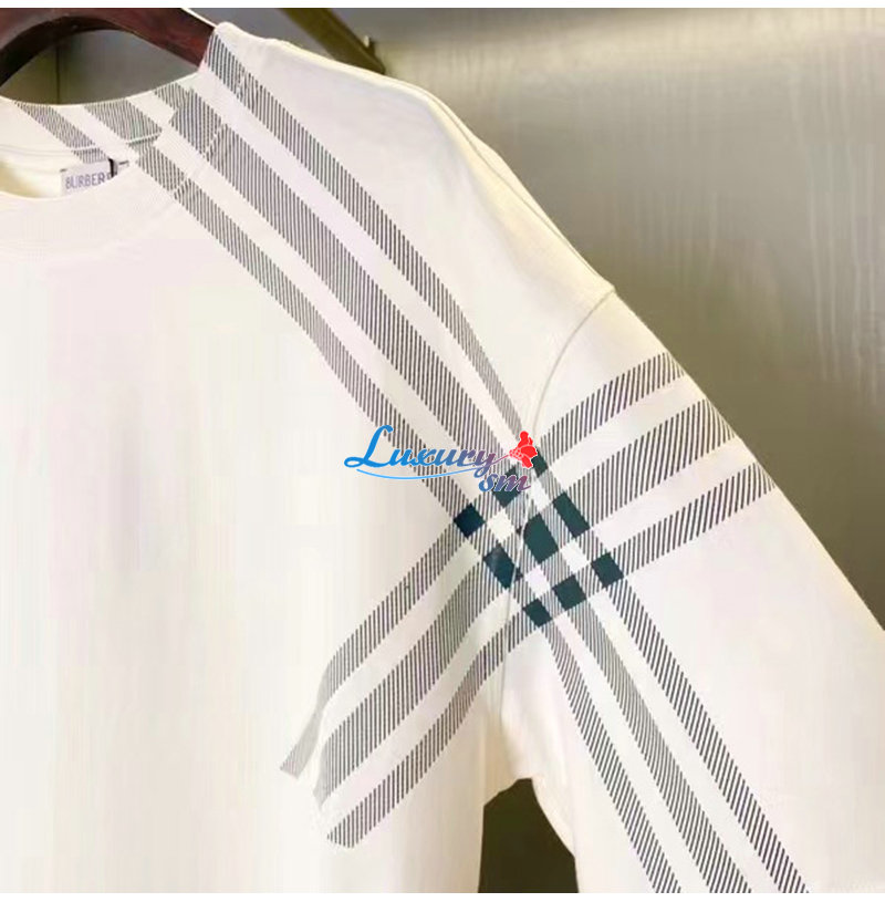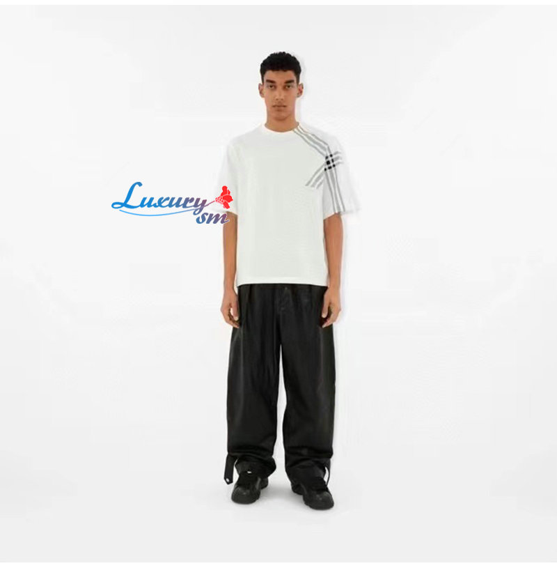 BURBERRY-80846851 버버리 화이트 체크 슬리브 코튼 티셔츠 남성용