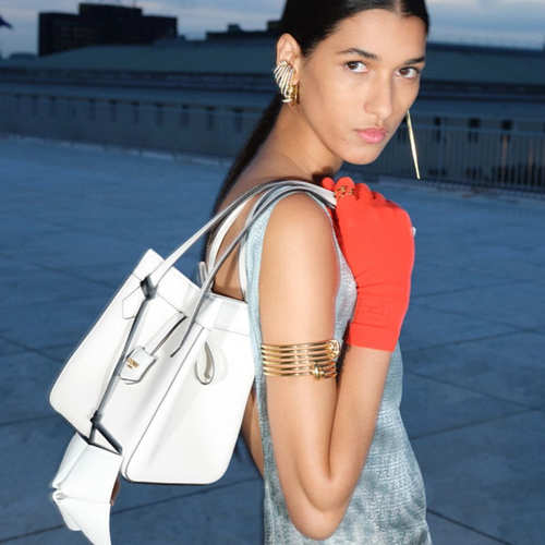백을 오리가미 스타일로 접어 버킷백으로 연출할수 있으며 각 면의 짧은 숄더스트랩을 부드럽게