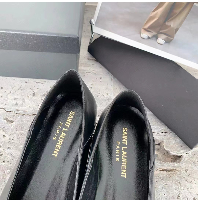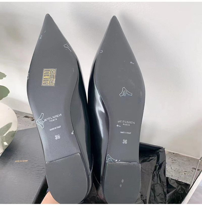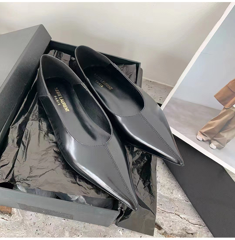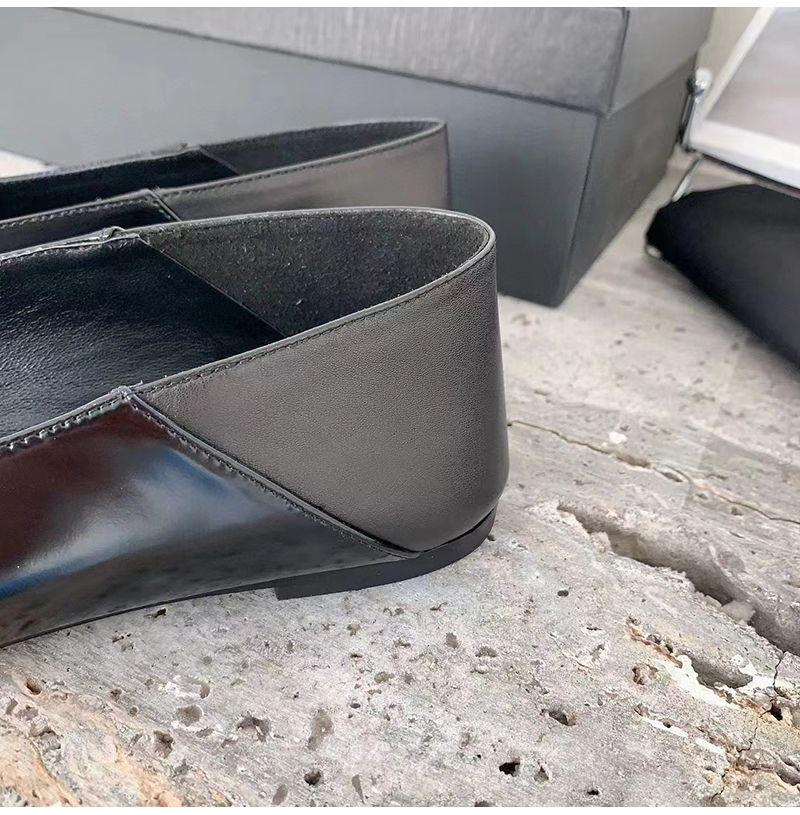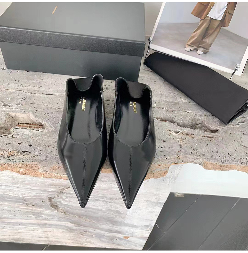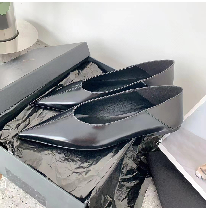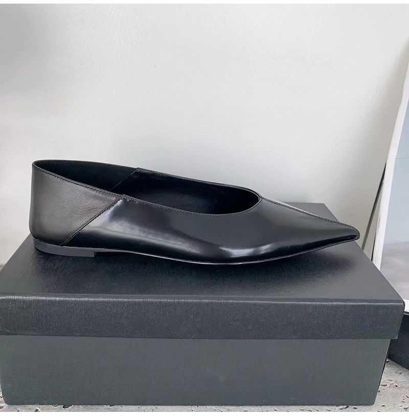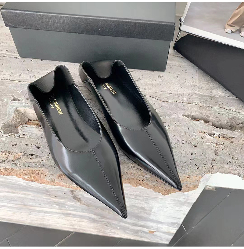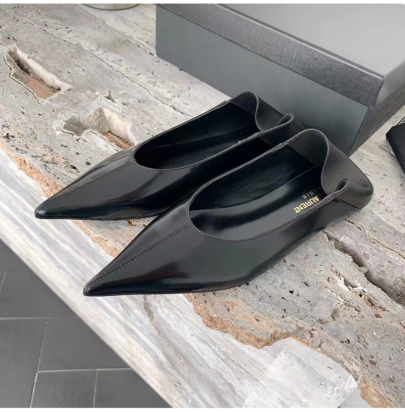 플랫 슬리퍼. 포인티드 토, V 컷 뱀프, 위로 올리거